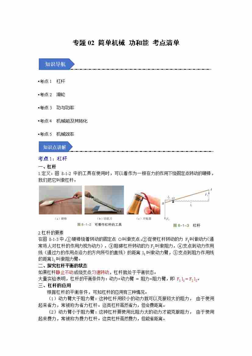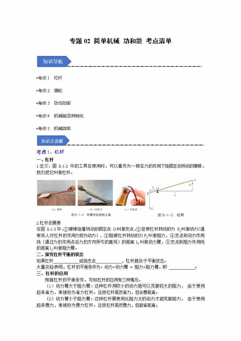 专题02 简单机械 功和能 (考点清单)(学生版)