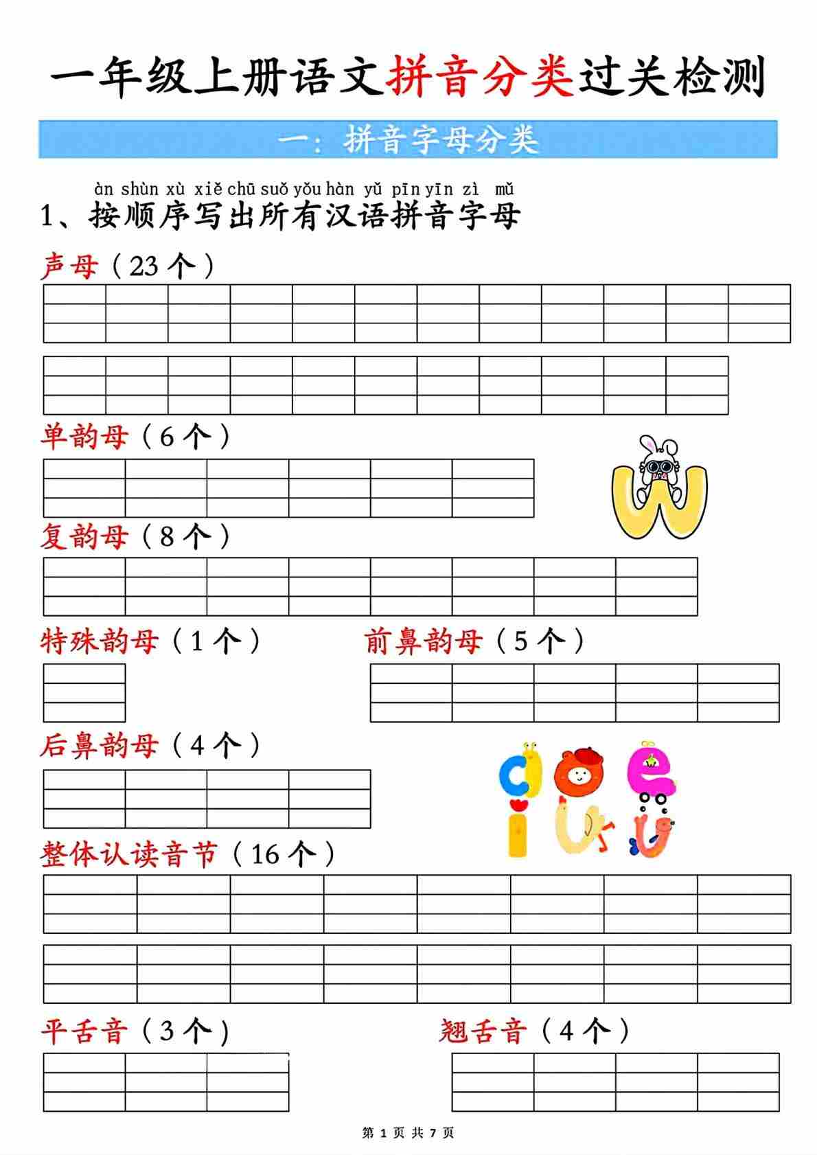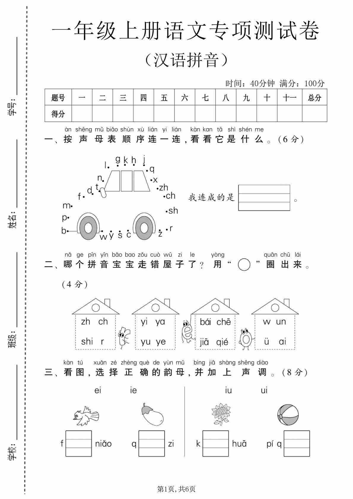 一年级(上)语文 拼音必考六项练习卷