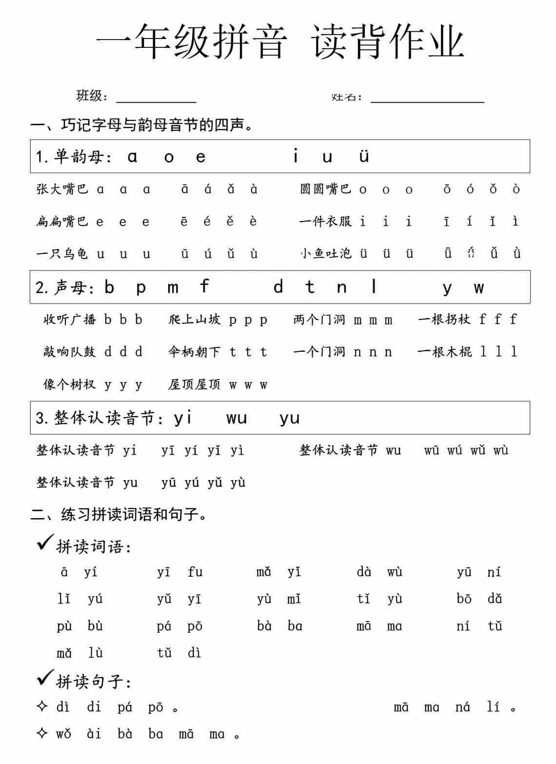 一年级(上)语文 拼音拼读周末读背作业