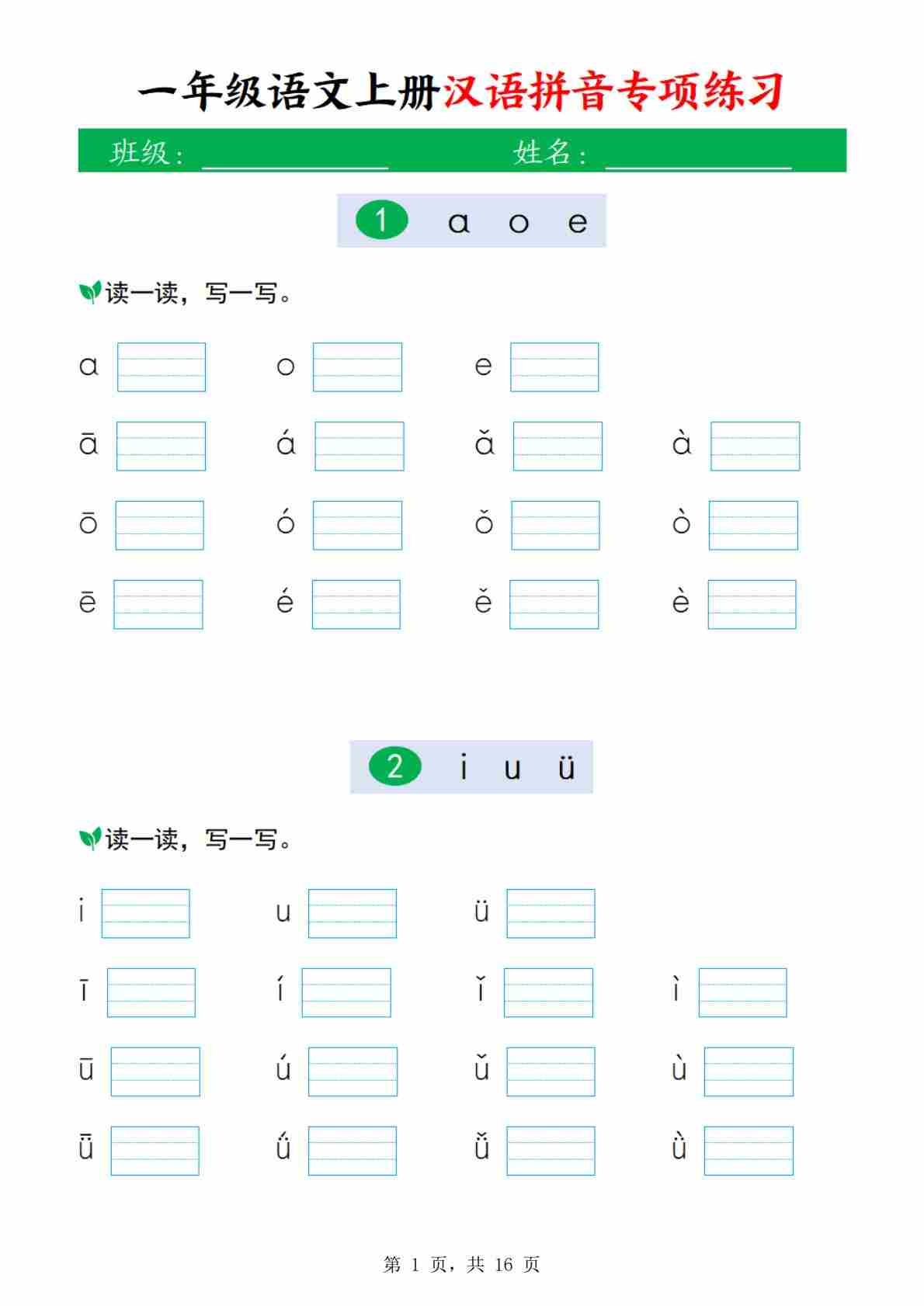 一年级上册语文汉语拼音专项练习