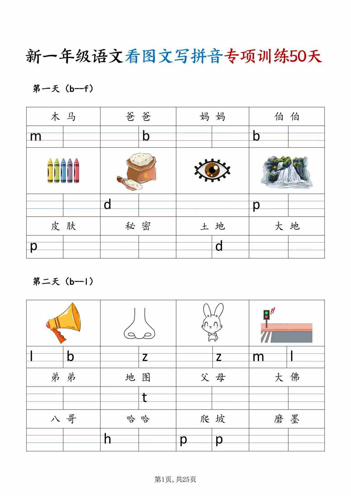 一年级(上)语文 看图文写拼音专项训练50天