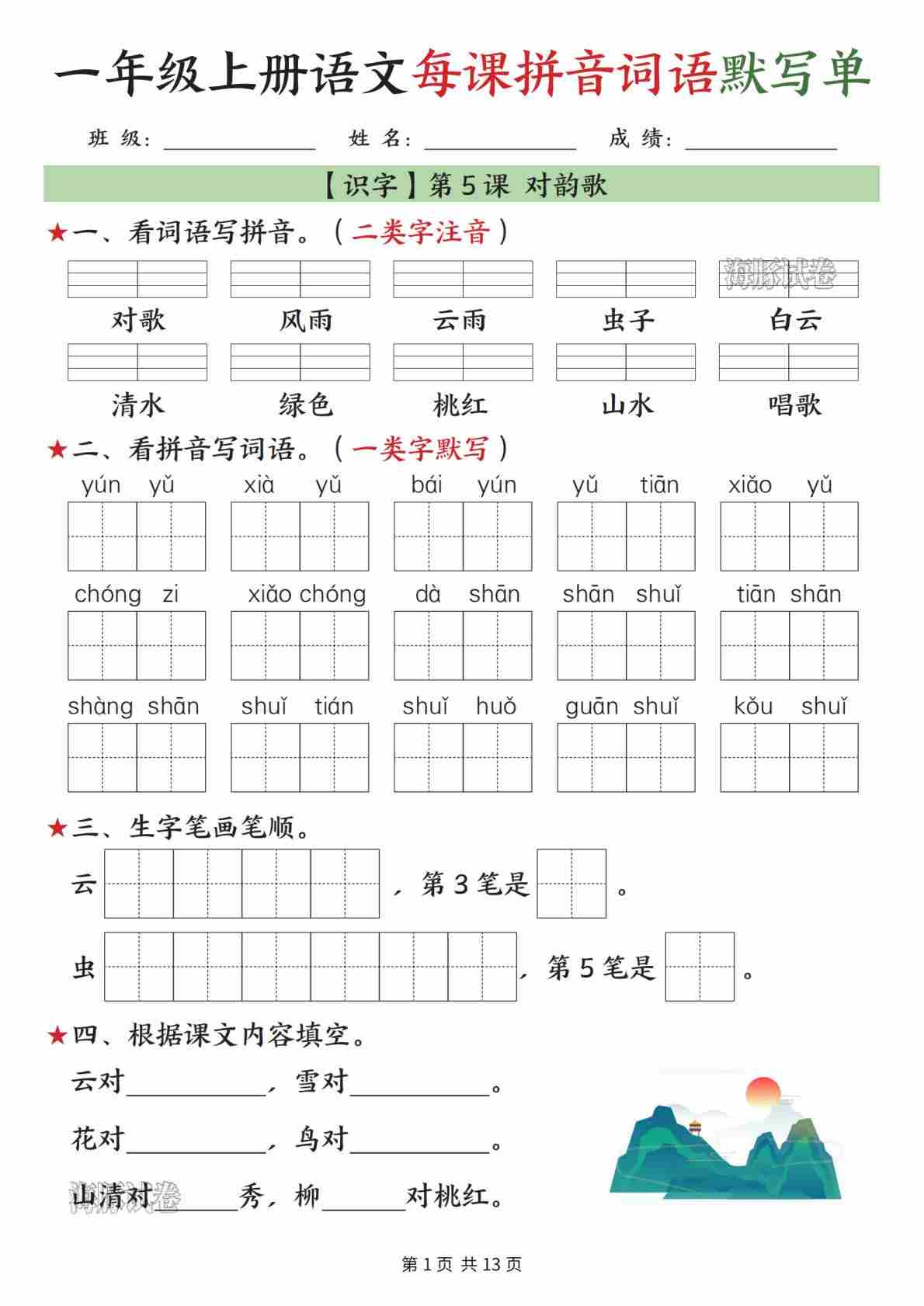 一年级(上)语文每课拼音词语默写单