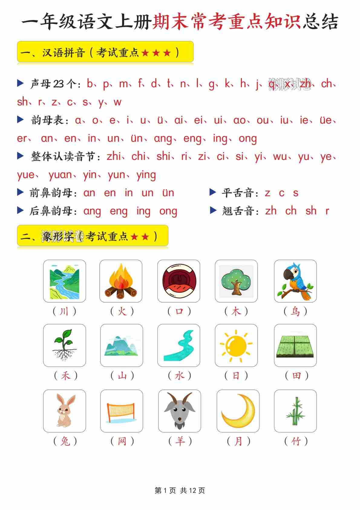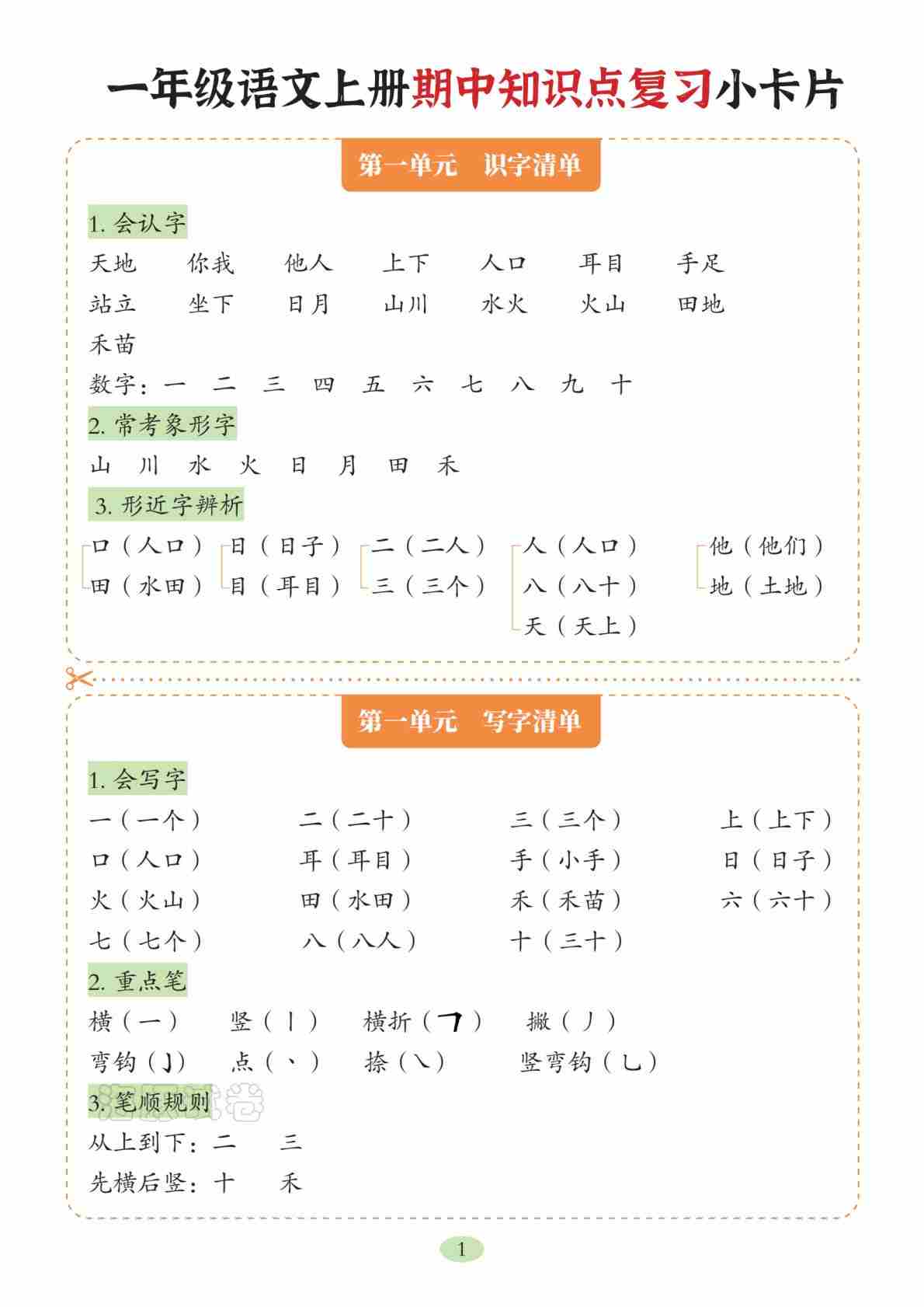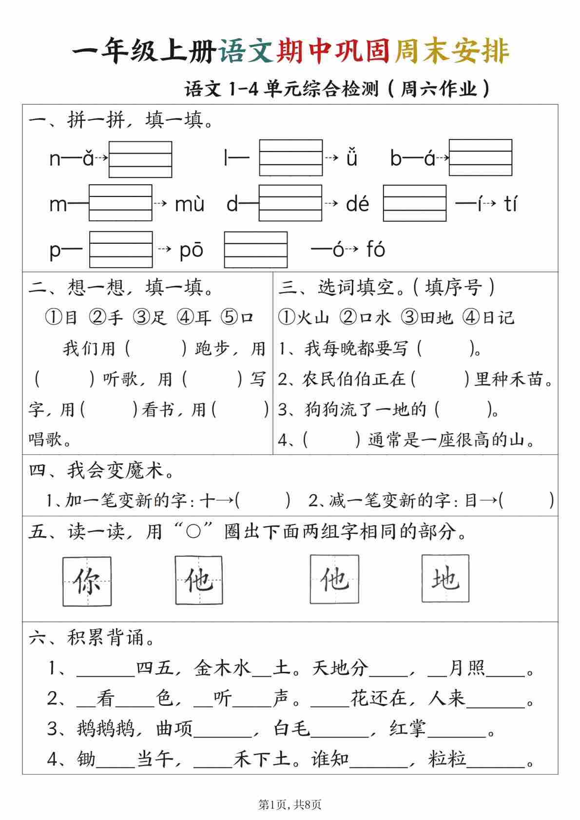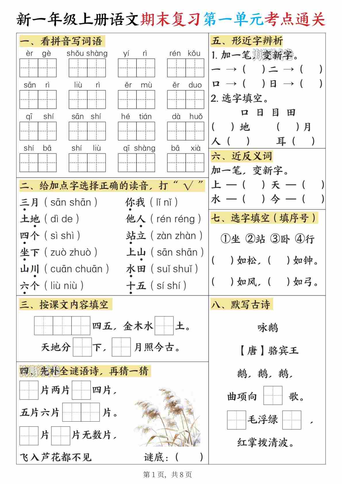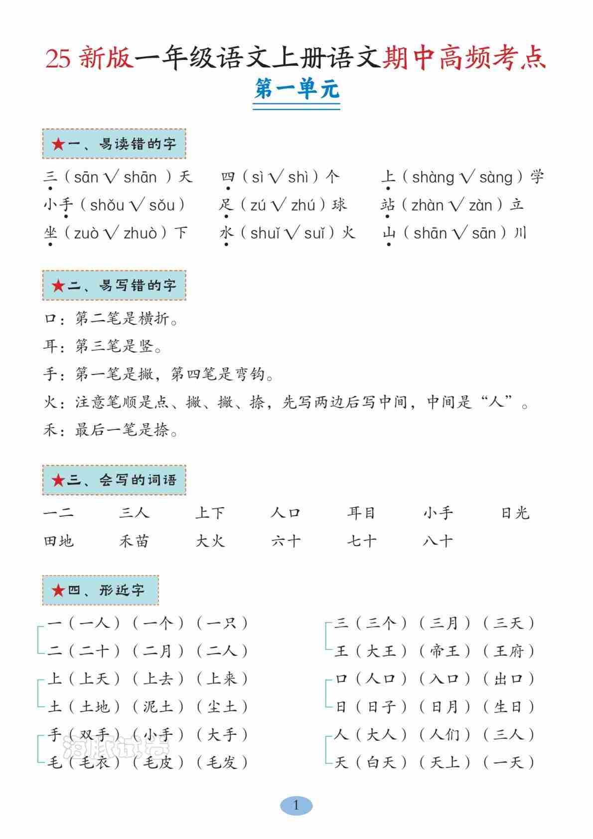 一年级(上)语文 1-4单元期中常考重点知识汇总