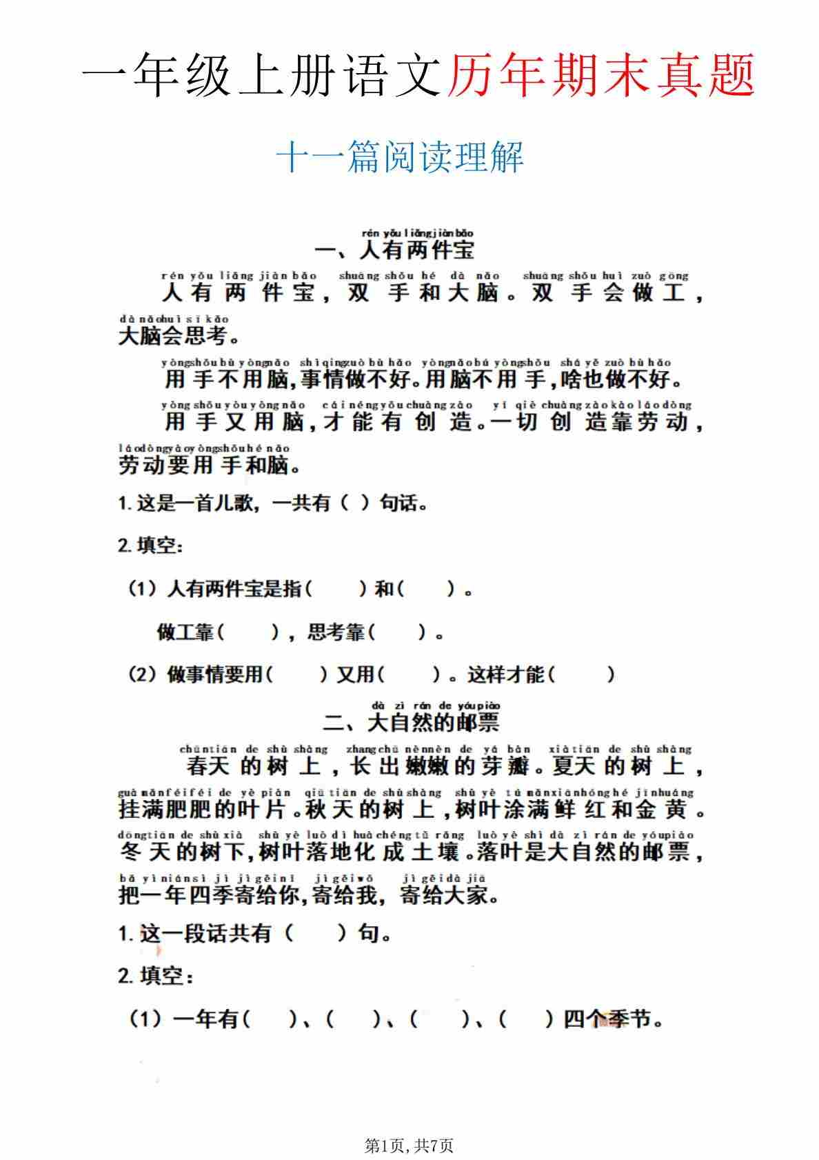 一年级(上)语文 历年期末考过十一篇阅读理解
