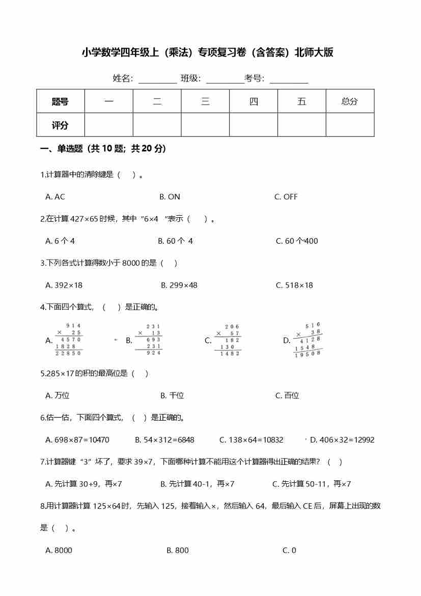 【期末专项培优】四上数学(乘法)专项复习卷(含答案)北师大版