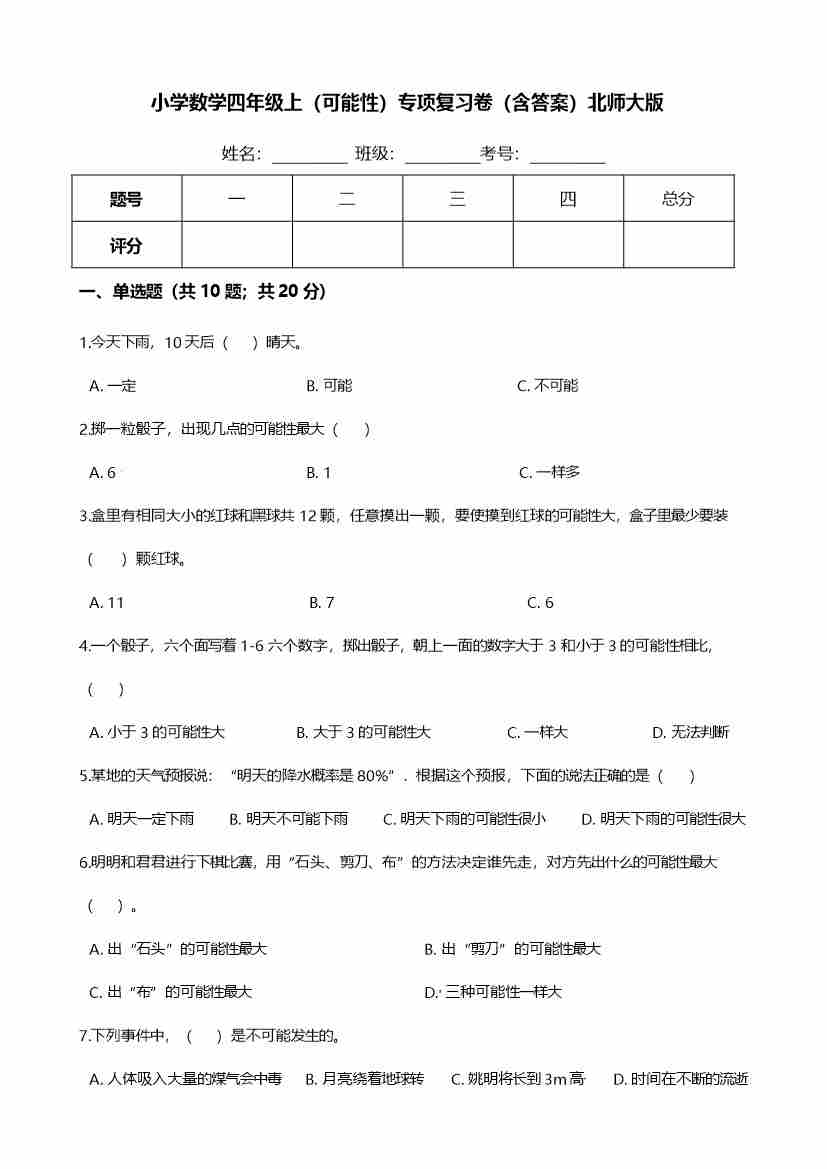 【期末专项培优】四上数学(可能性)专项复习卷(含答案)北师大版