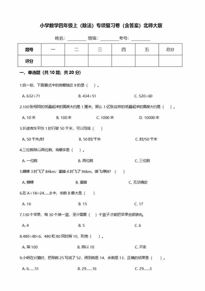 【期末专项培优】四上数学(除法)专项复习卷(含答案)北师大版