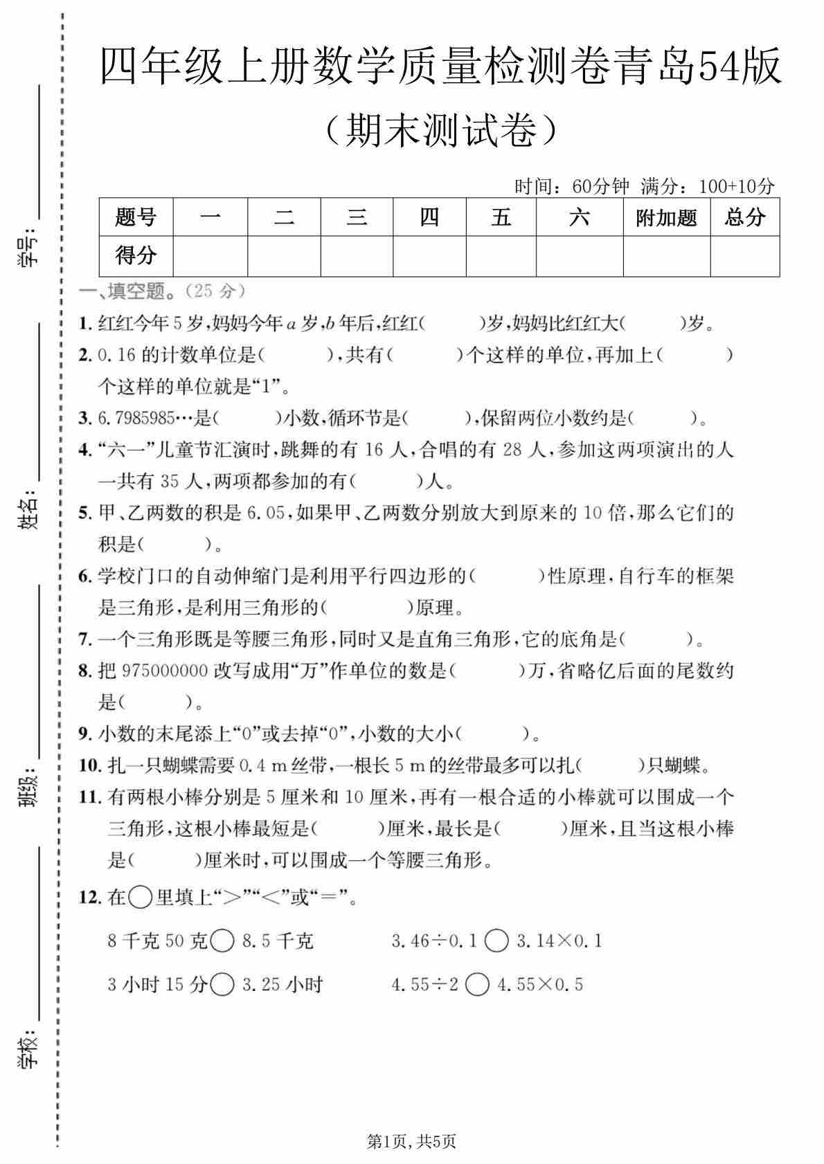 四年级(上)数学期末质量检测卷4《青岛54版》