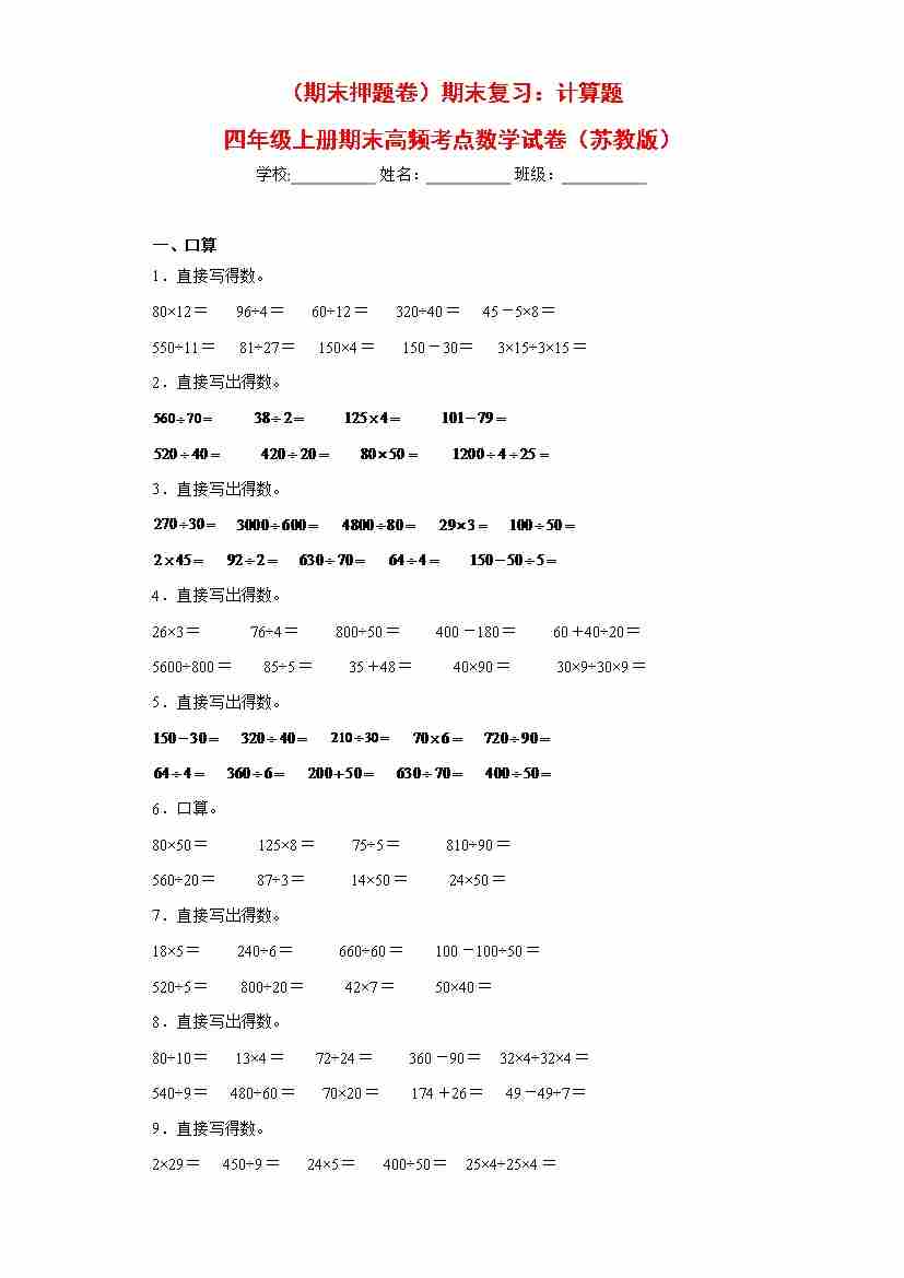 期末复习:计算题(试题)四年级上册期末高频考点数学试卷(苏教版)