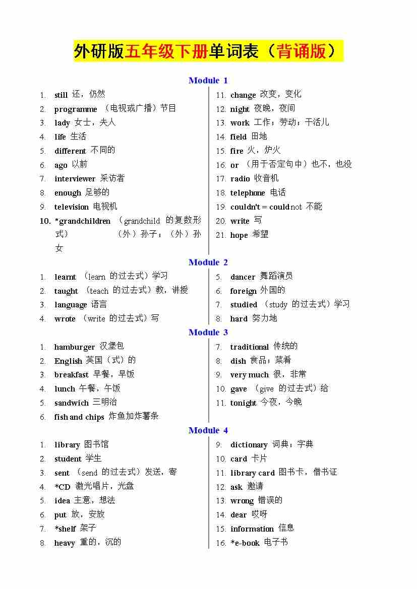 2025年春 外研版 新五下 单词表(背诵版)