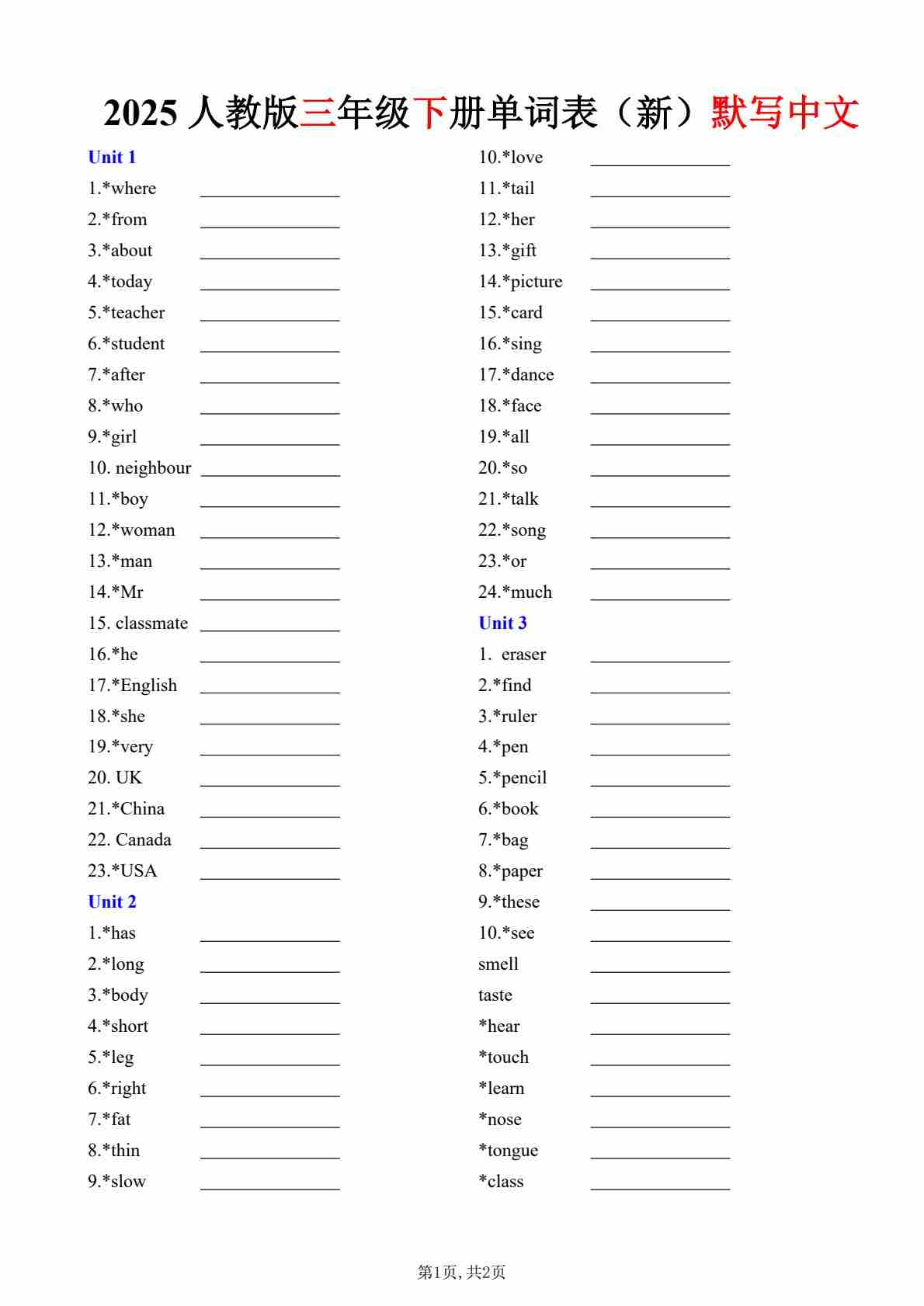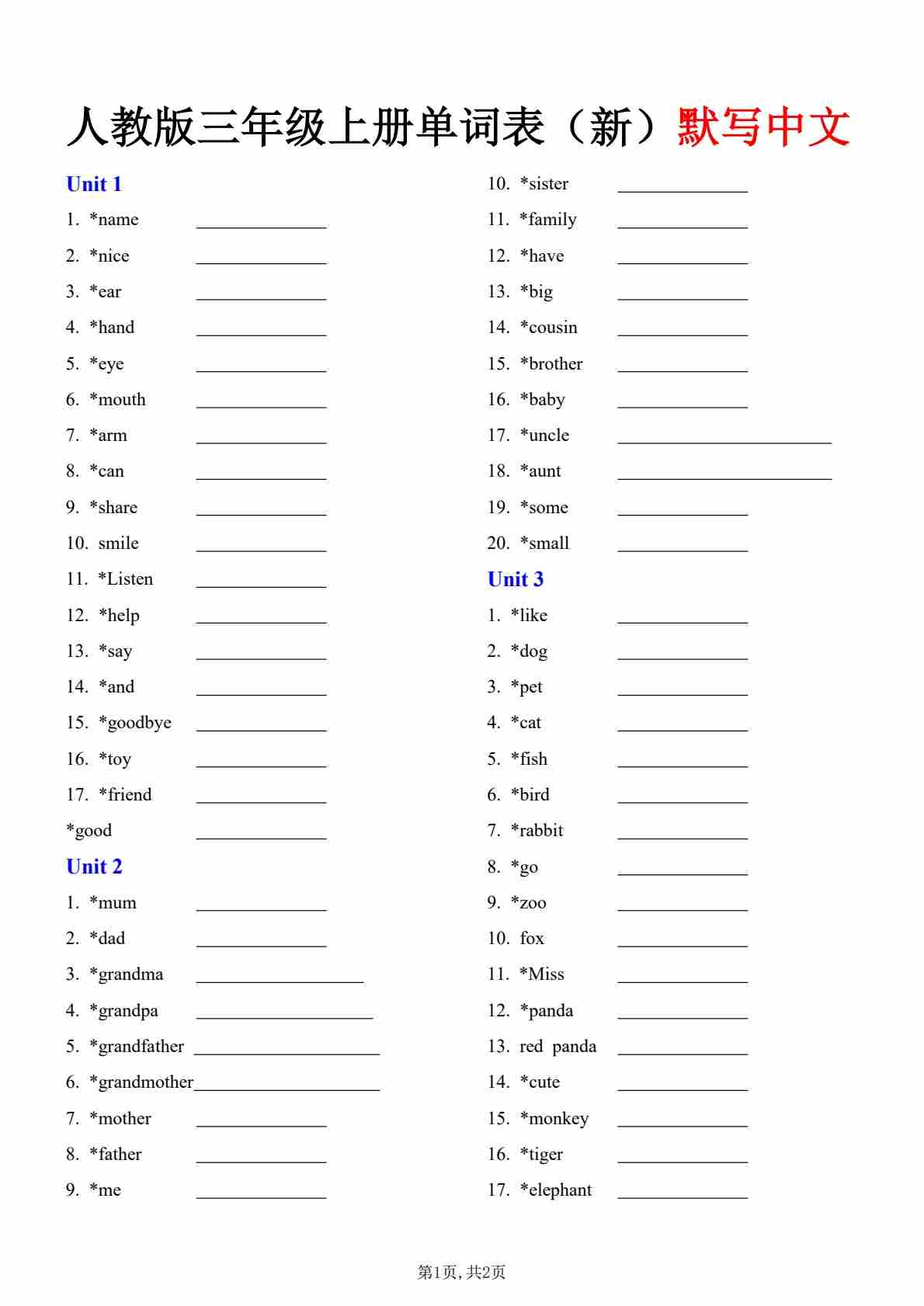 三年级上册新单词表 - 默写中文