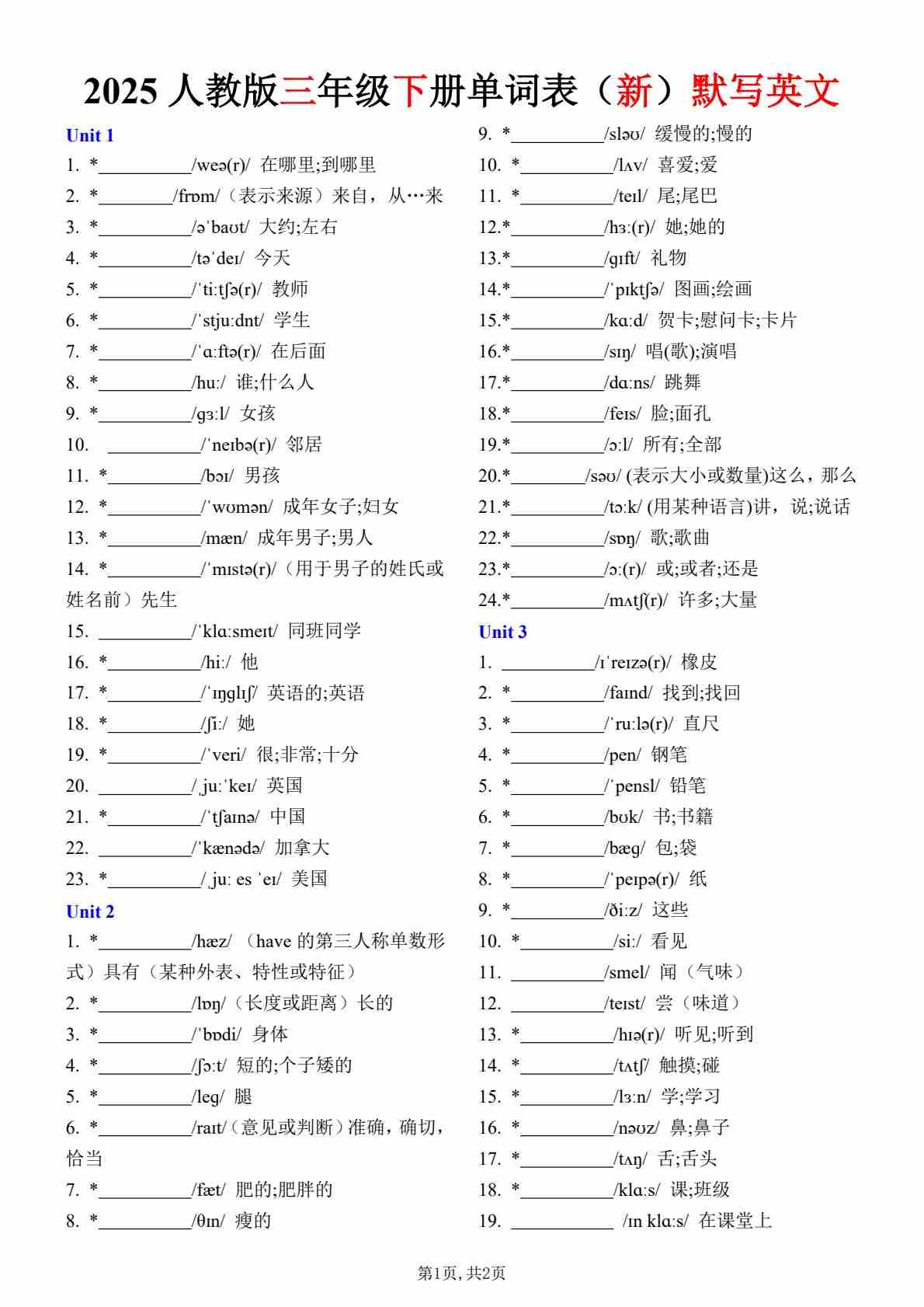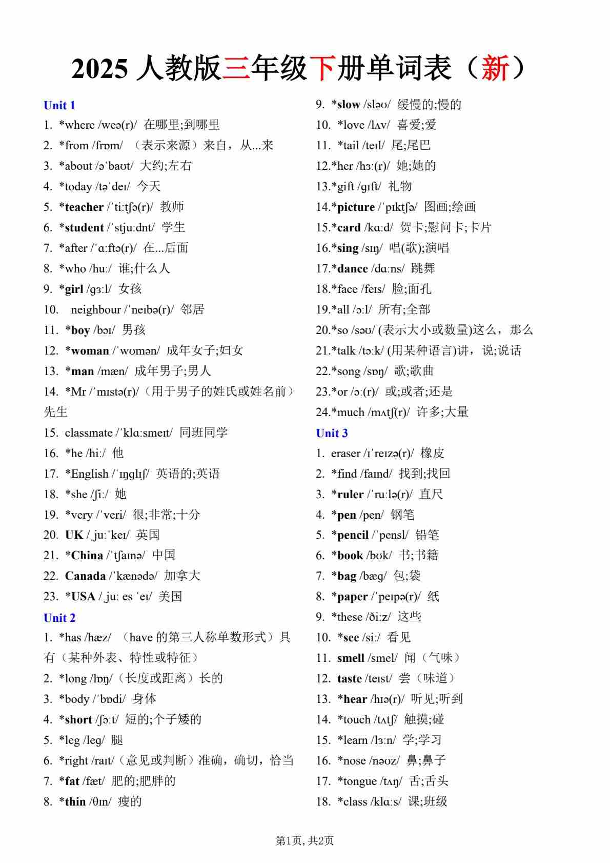 2025春三年级下册单词表