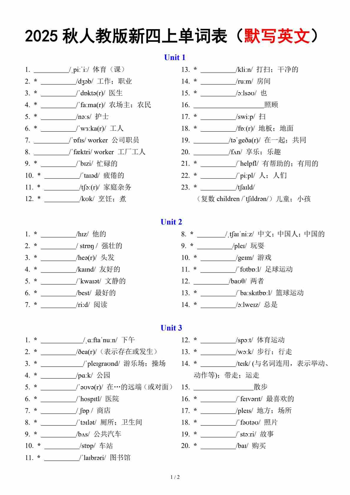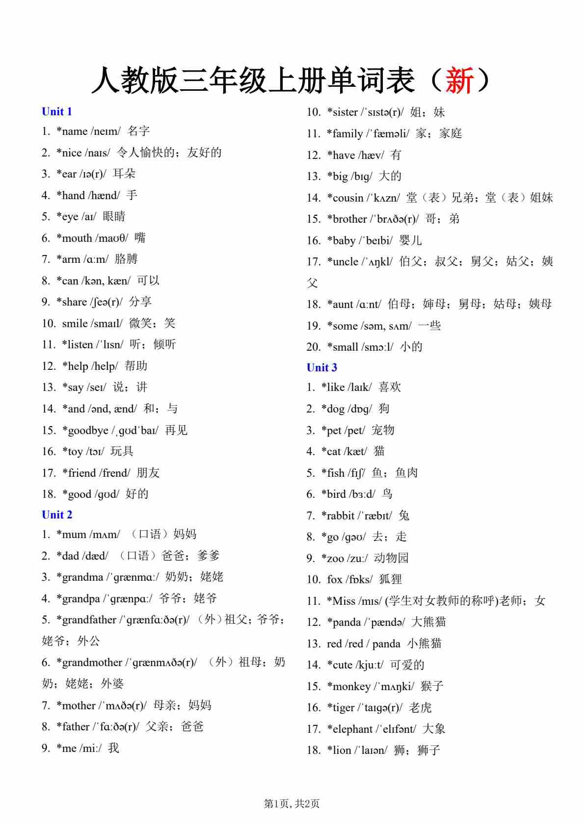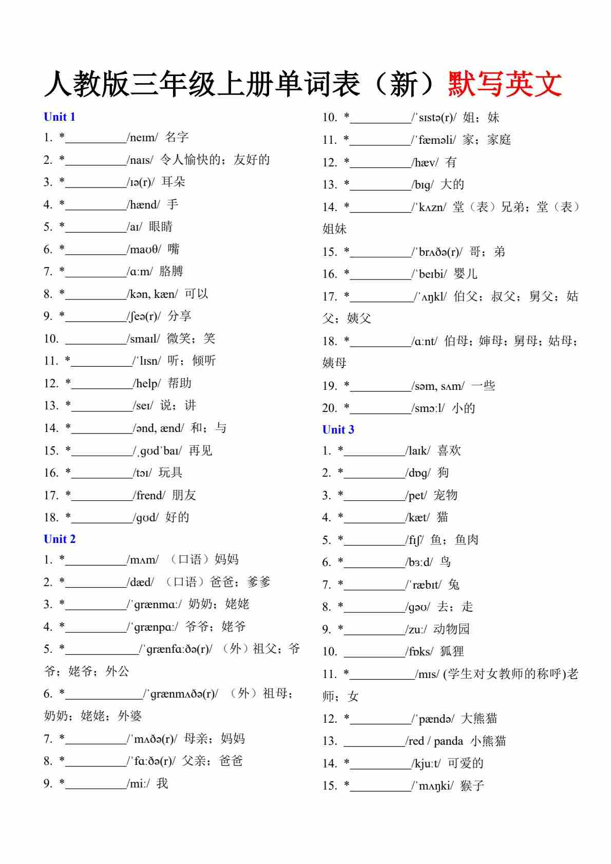 三年级上册新单词表 - 默写英文(音标提示)
