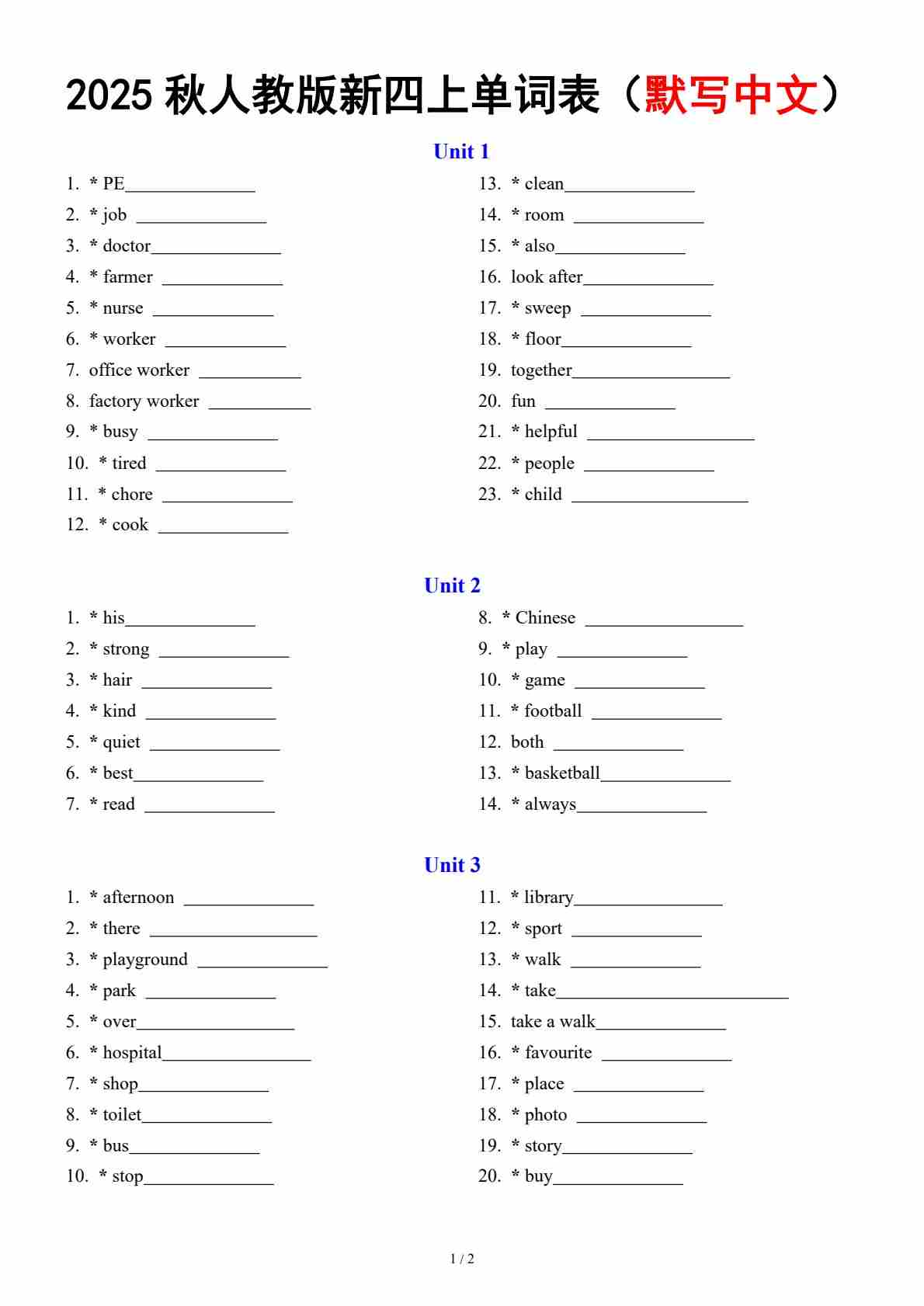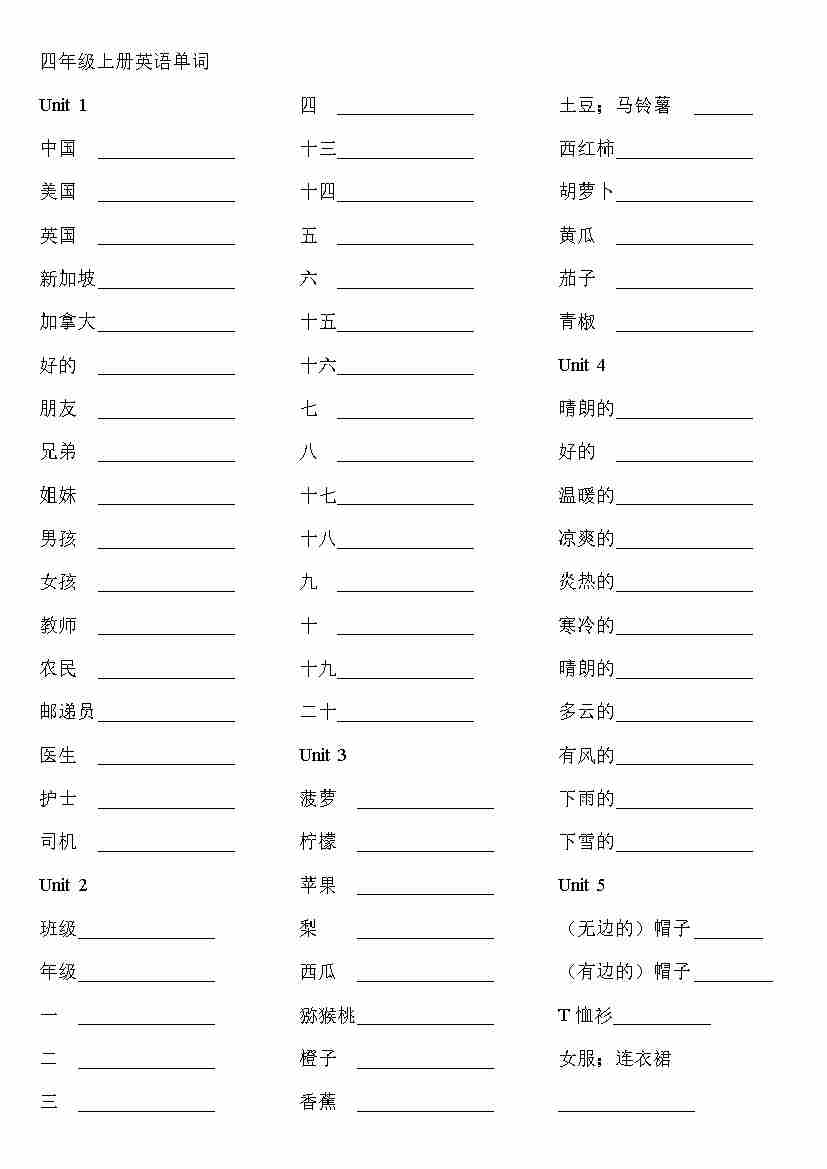 人教版新四上单词表 - (默写中文)