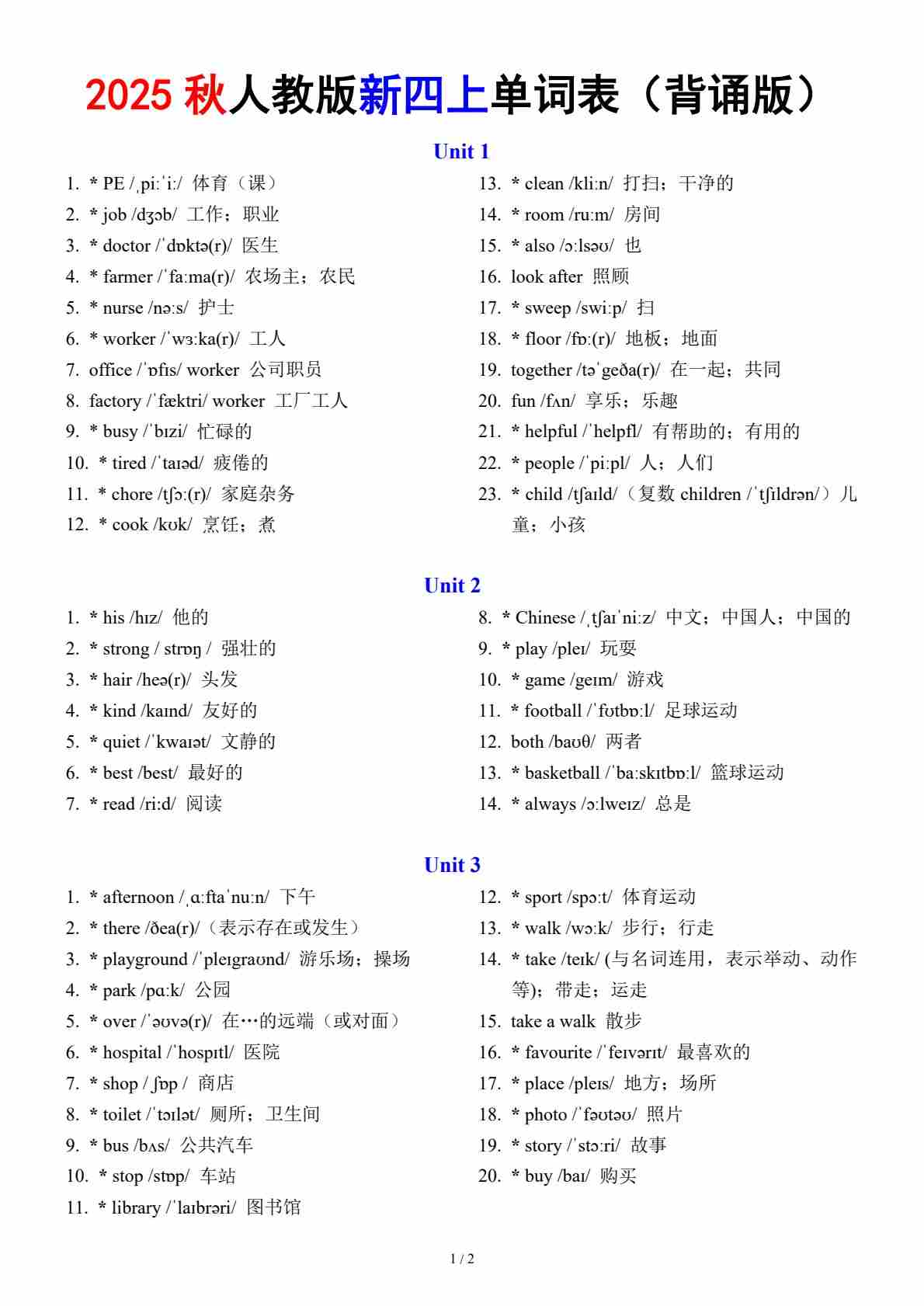 人教版新四上单词表(背诵版)