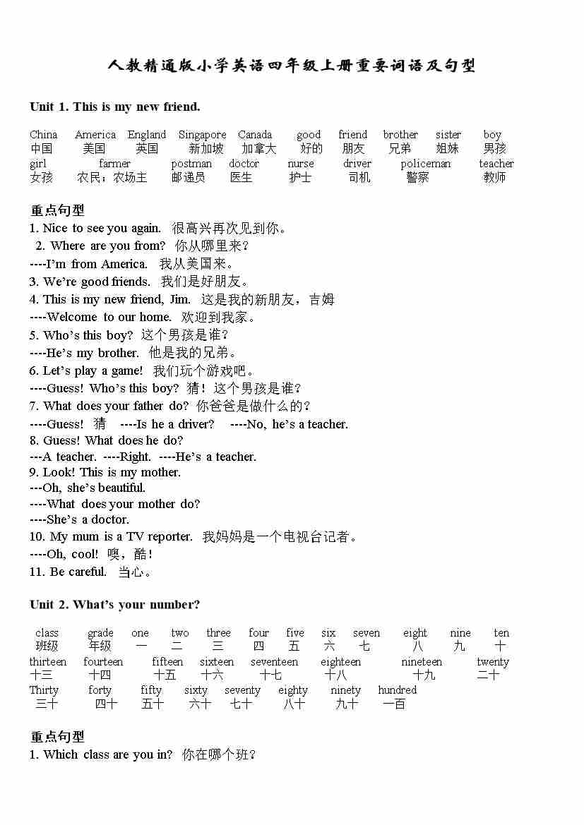 人教精通版4年级上册重点单词+句型默写9页