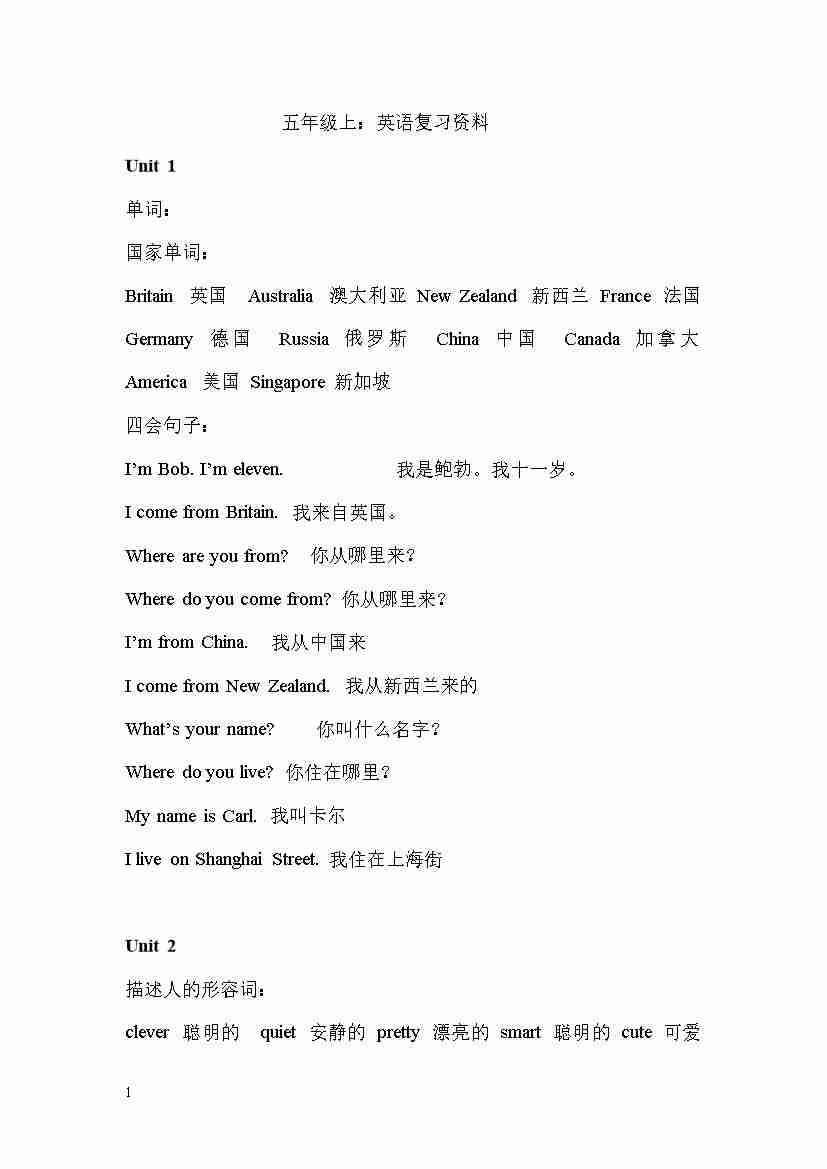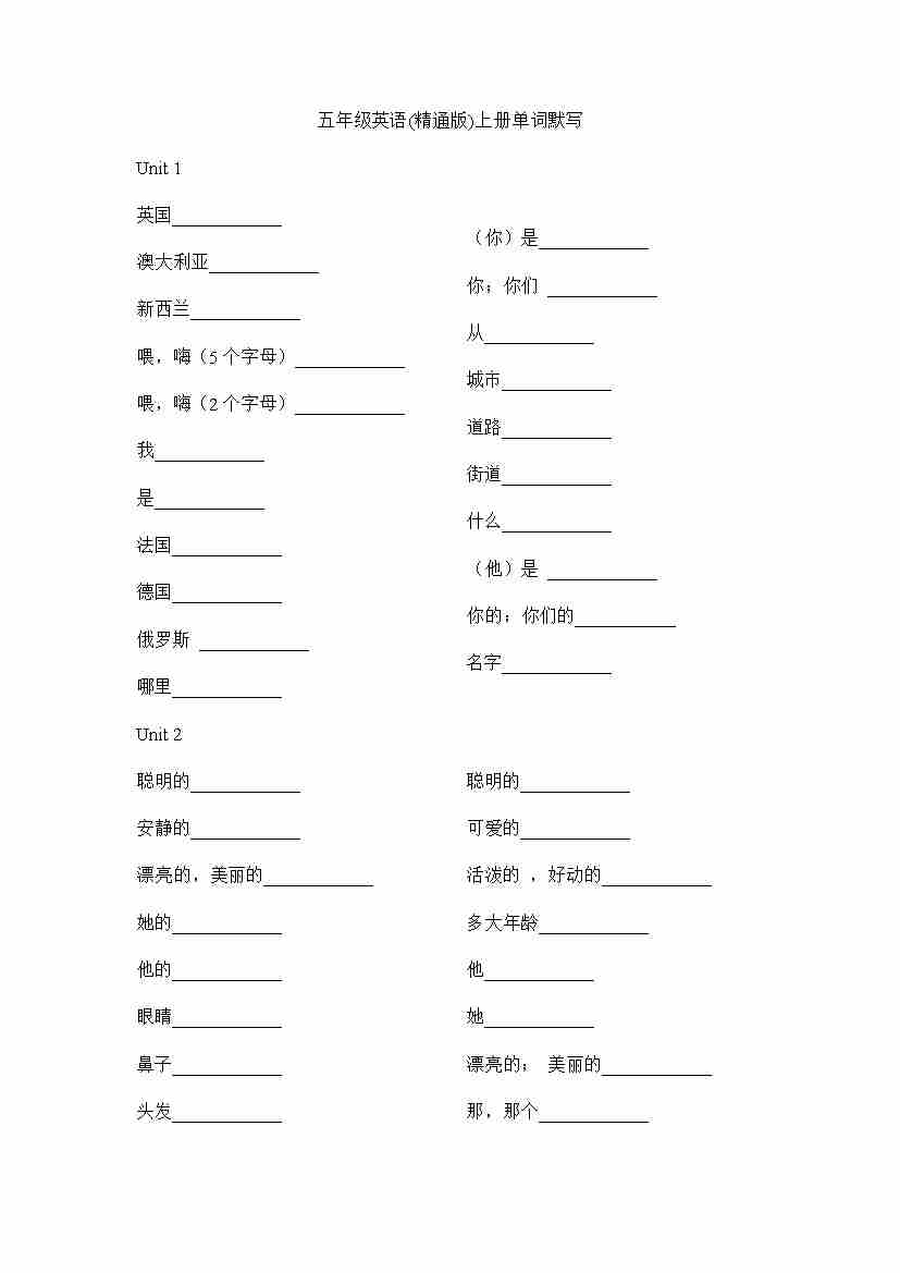 人教精通版5年级上册重点单词+句型默写7页
