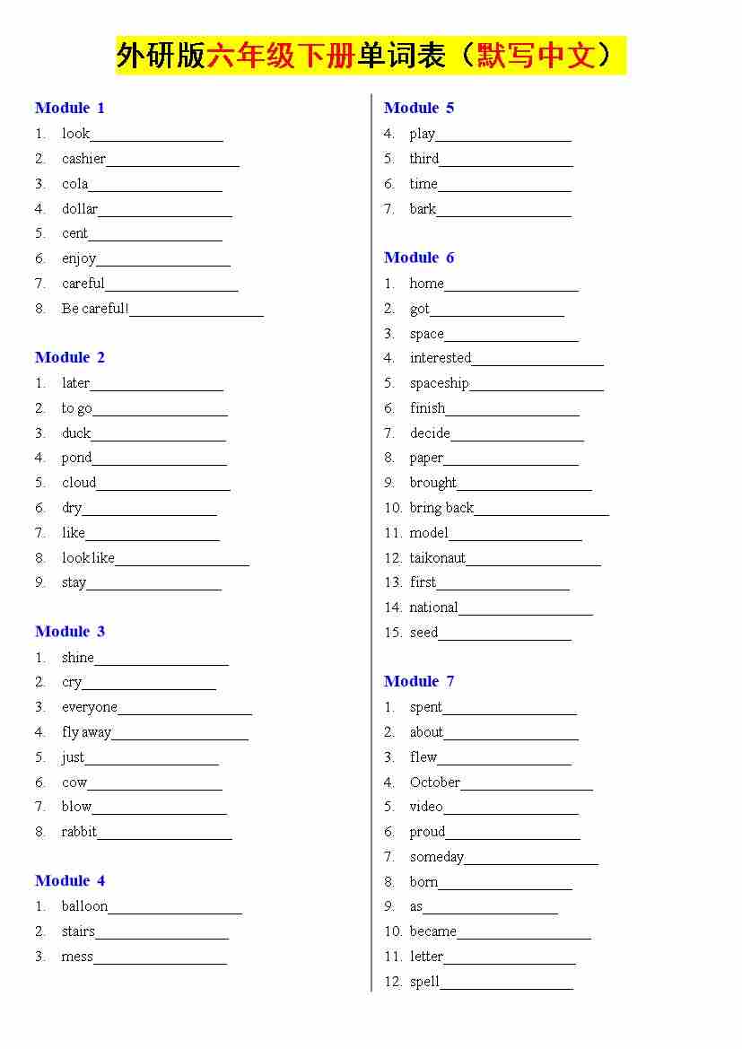外研版六年级下册单词表(默写英文)