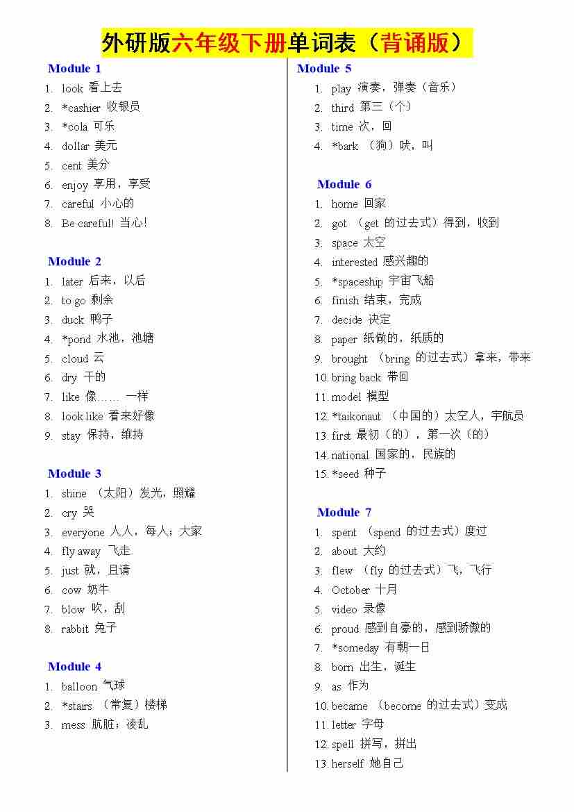 六下外研版单词表(背诵版)