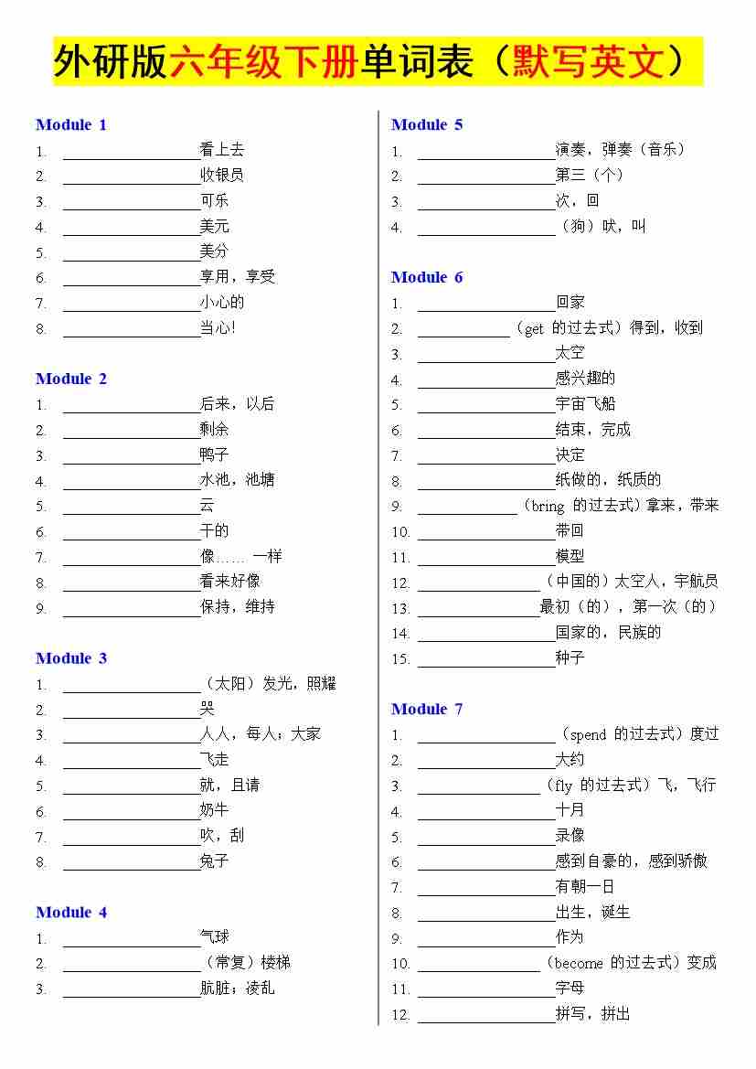 六下外研版单词表 - 默写中文