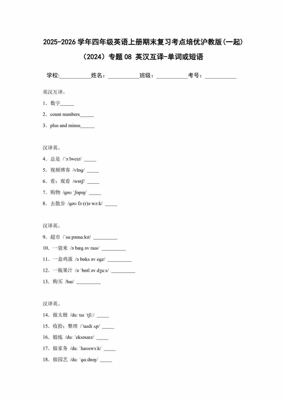 25秋四上沪教 08 英汉互译-单词或短语