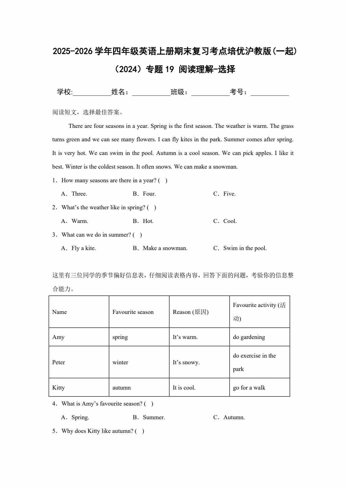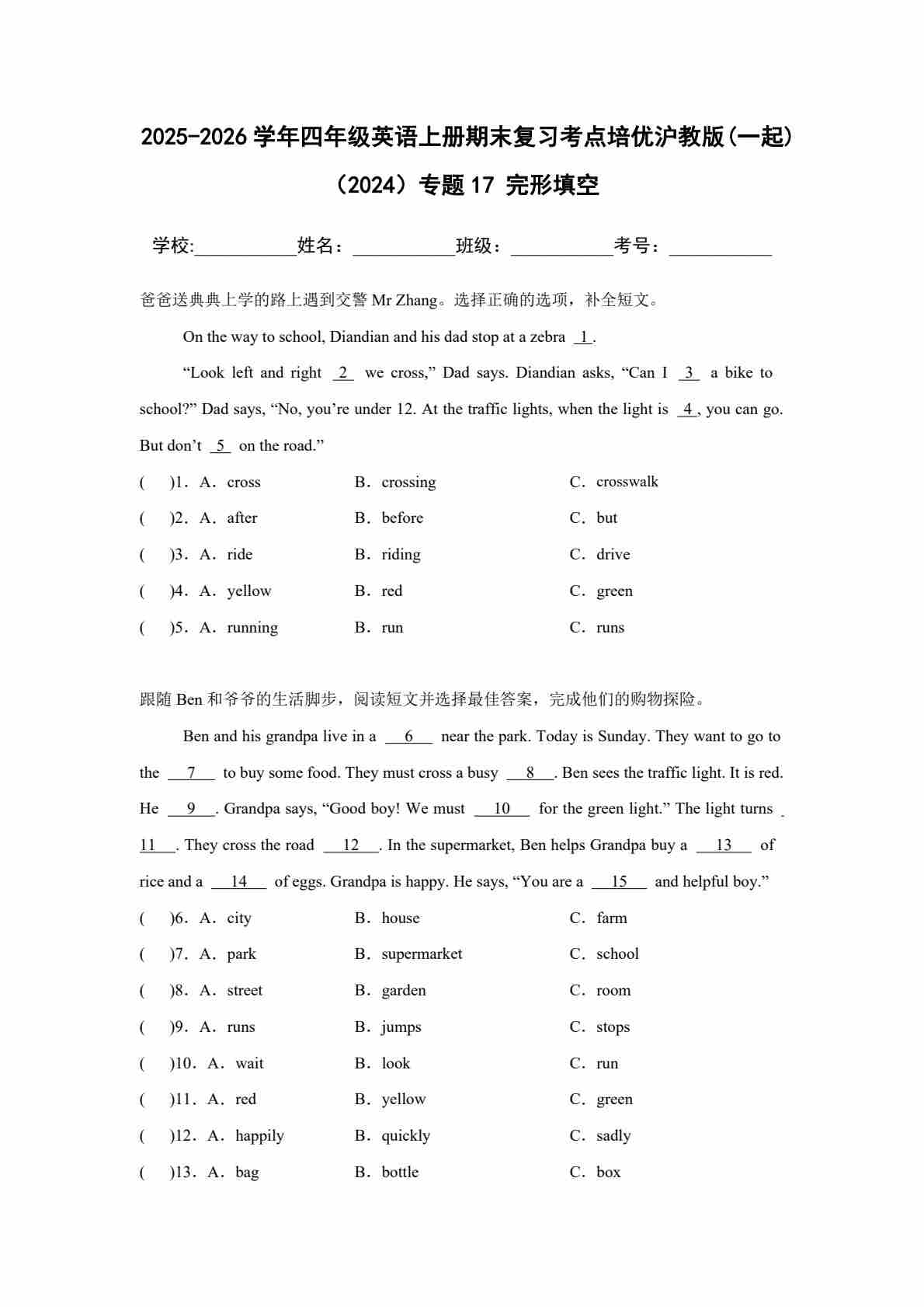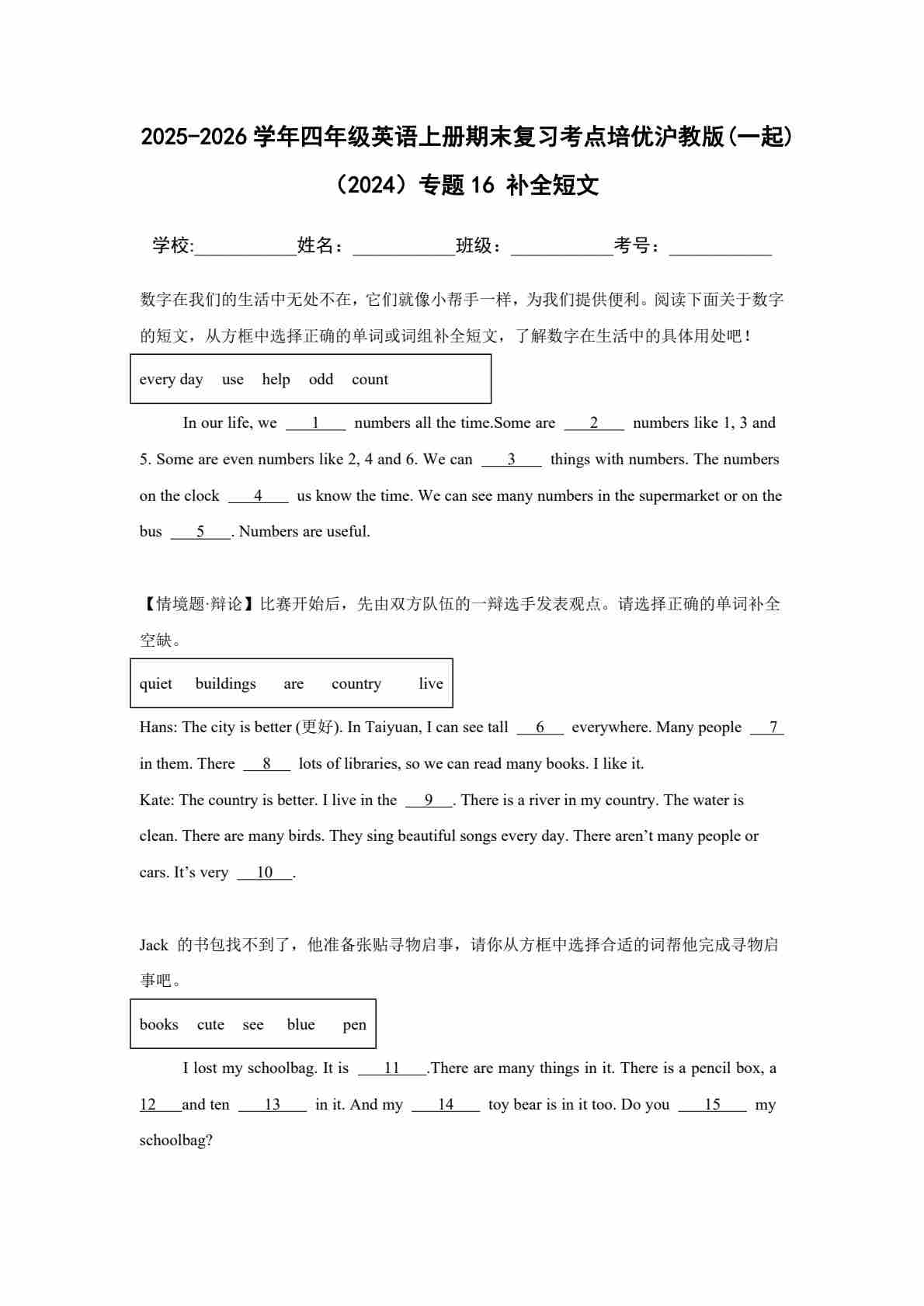 25秋四上沪教 16 补全短文