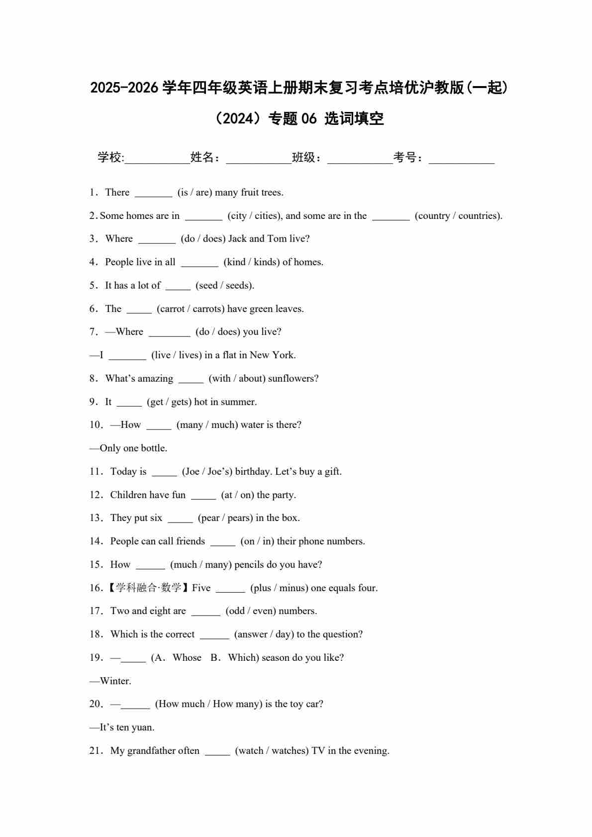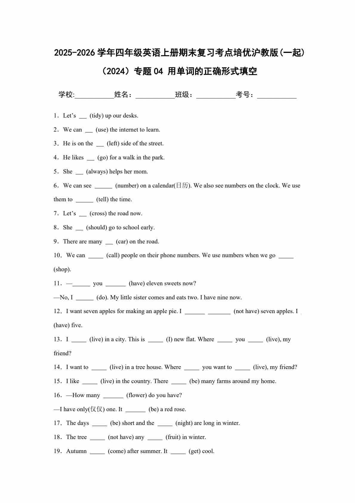 25秋四上沪教 04 用单词的正确形式填空