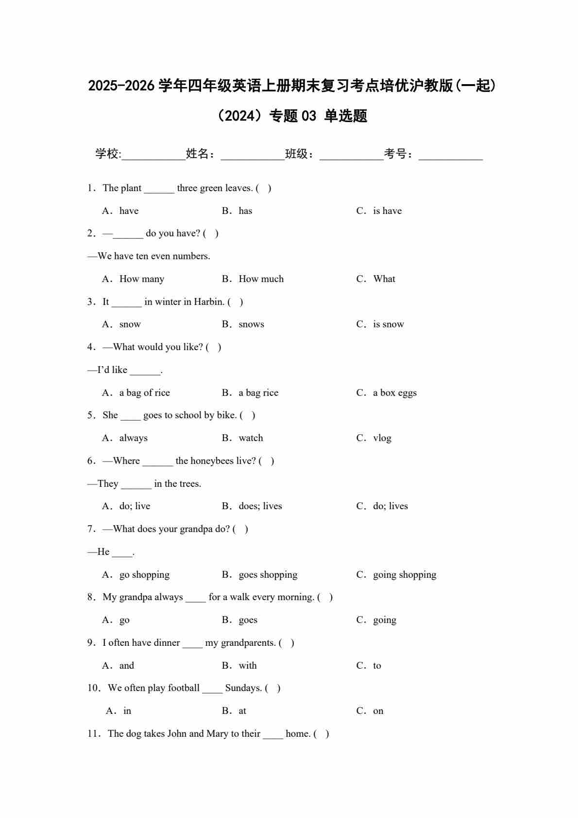 25秋四上沪教 03 单选题
