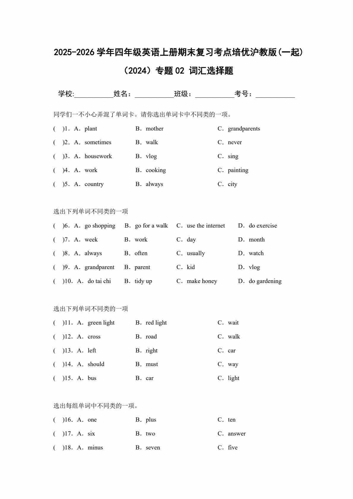 25秋四上沪教 02 词汇选择题