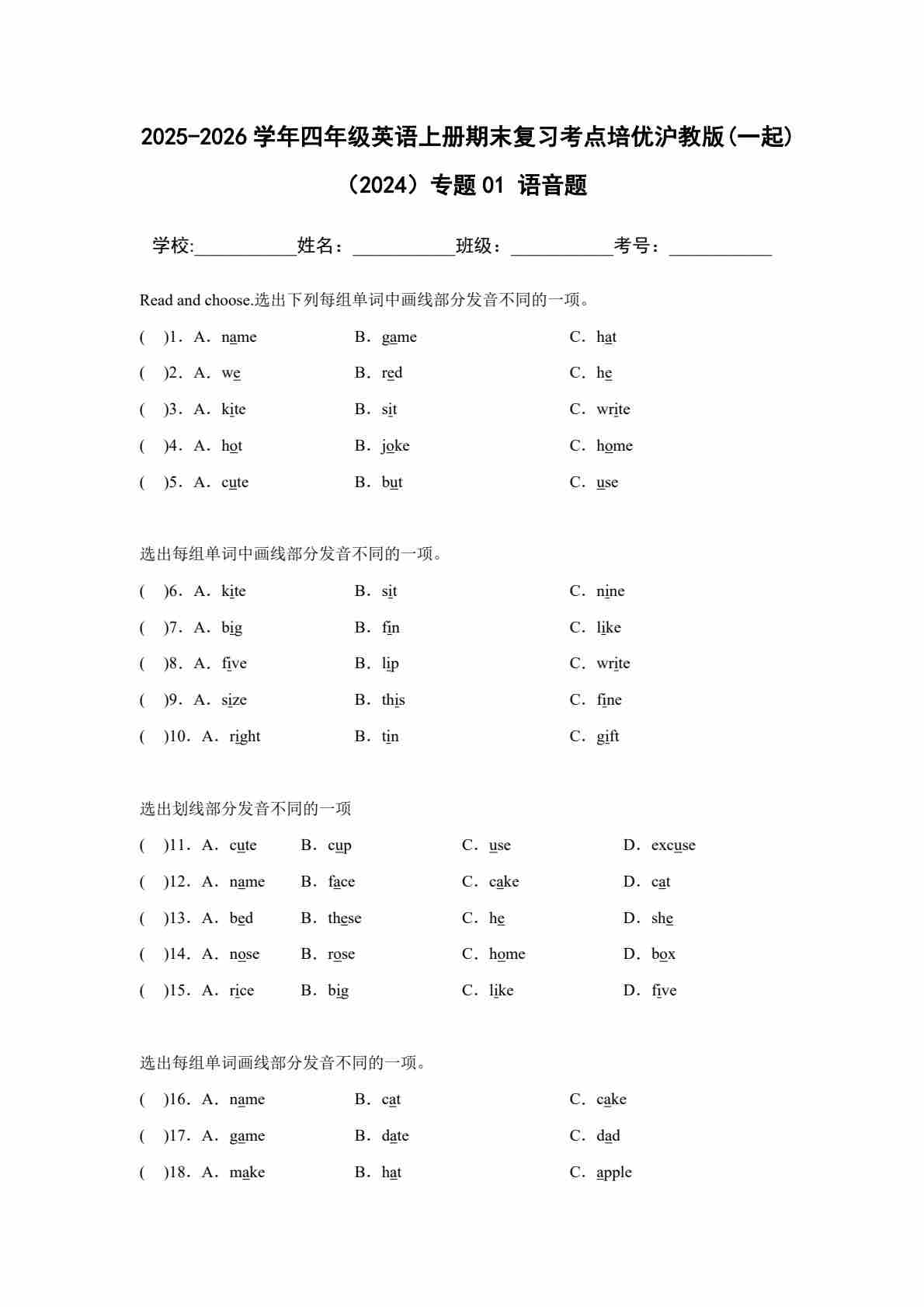 25秋四上沪教 01 语音题