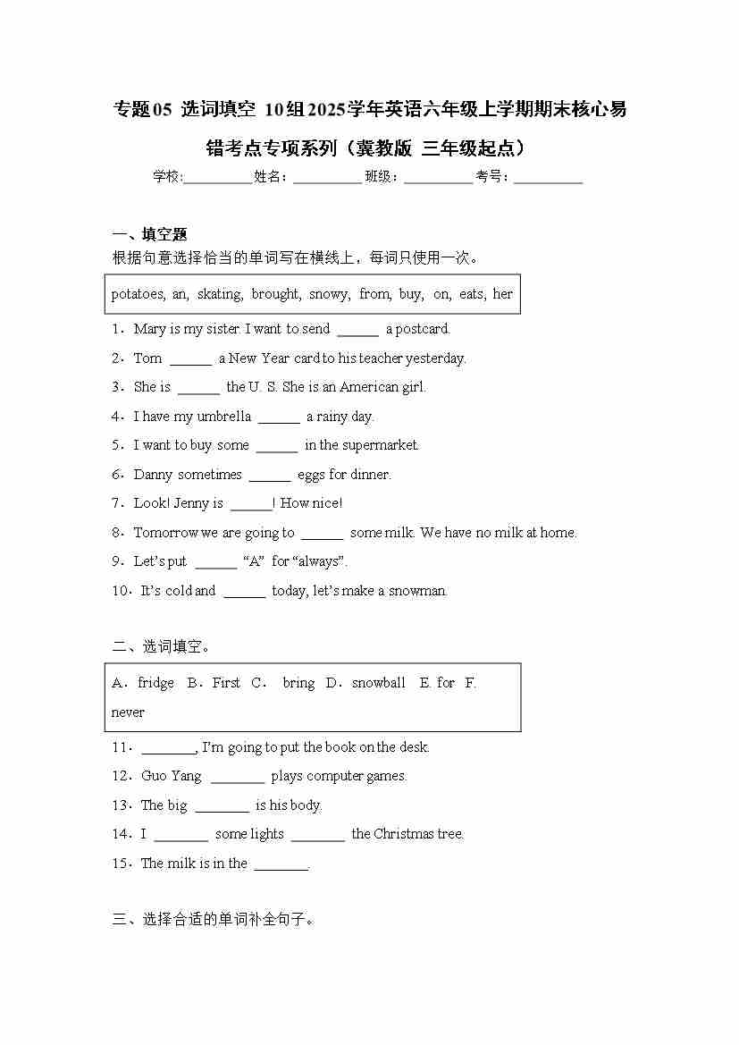 专题05 选词填空 10组-(冀教版 三年级起点)