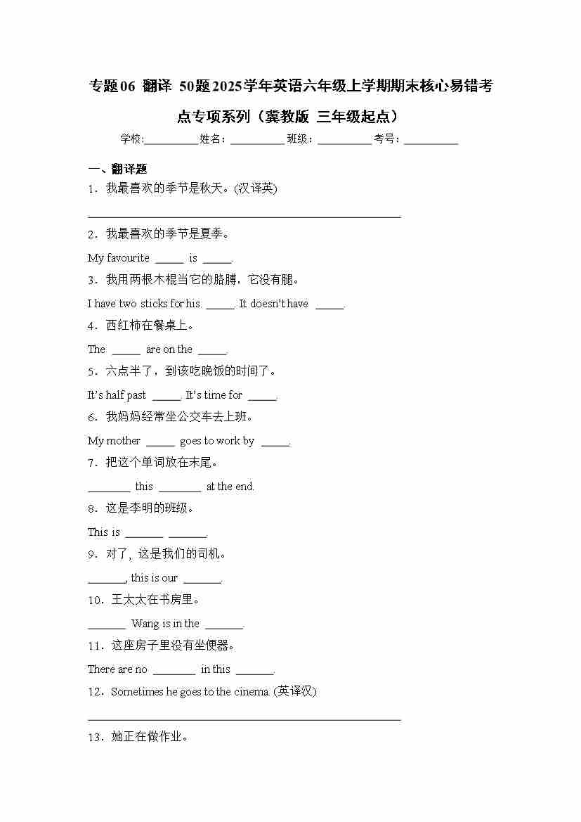 专题06 翻译 50题-(冀教版 三年级起点)