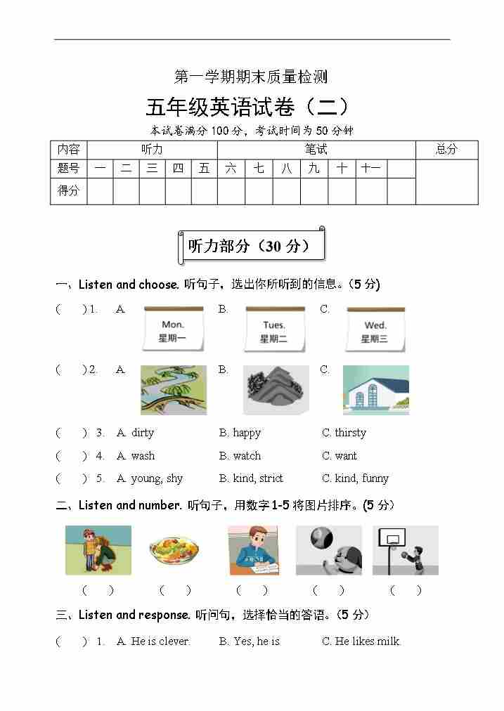 五年级(上)英语 期末拔尖测试卷《人教版PEP》2