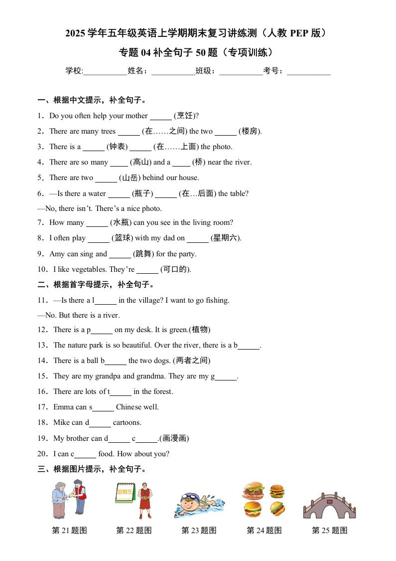 专题04补全句子50题(专项训练)五年级英语上学期期末复习讲练测(人教PEP版)