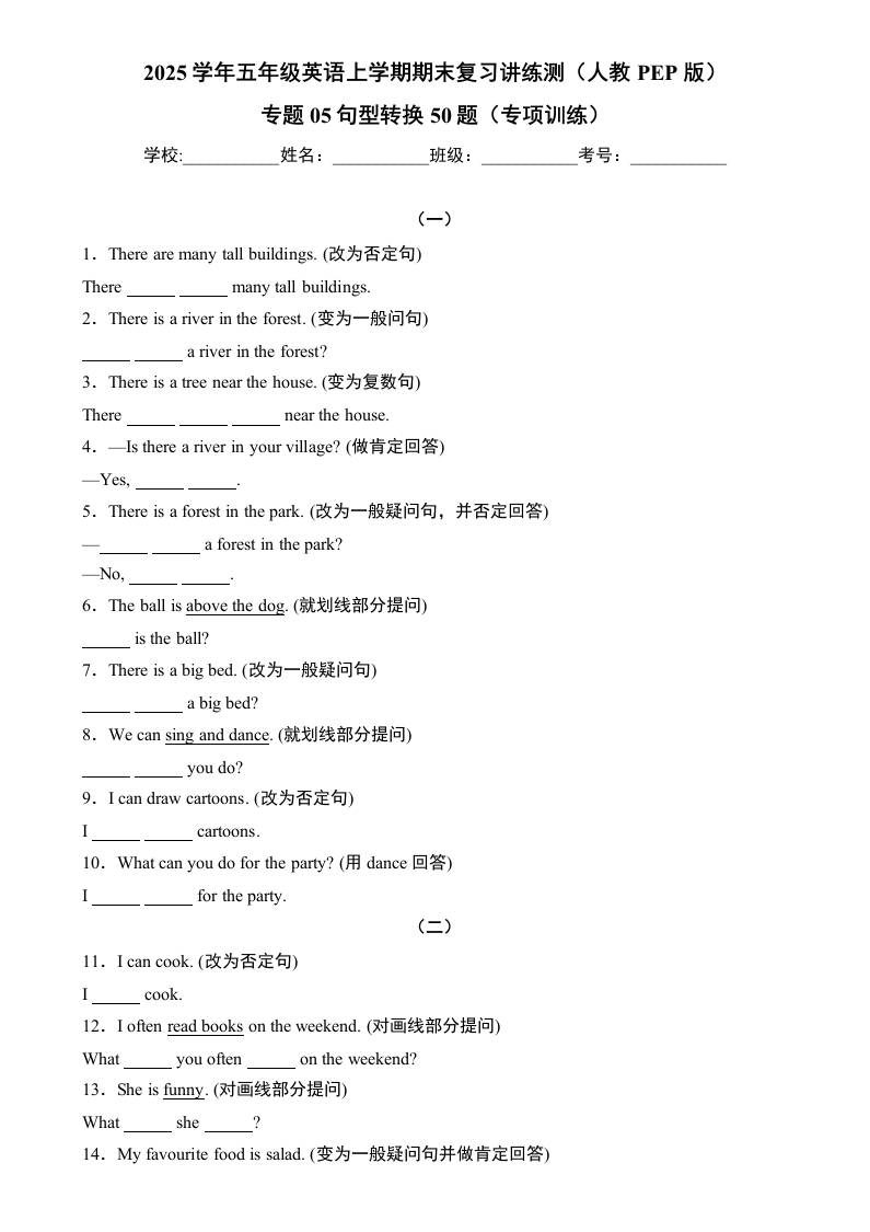 专题05句型转换50题(专项训练)五年级英语上学期期末复习讲练测(人教PEP版)