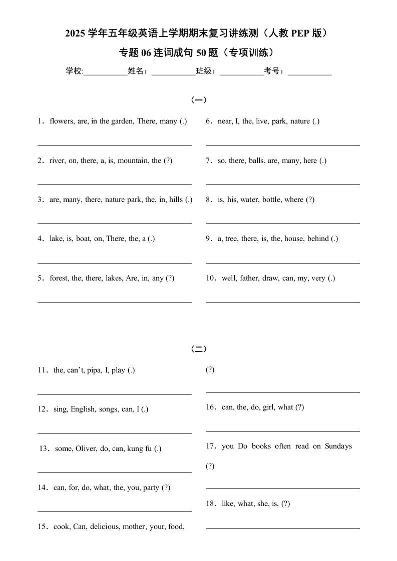 专题06连词成句50题(专项训练)五年级英语上学期期末复习讲练测(人教PEP版)