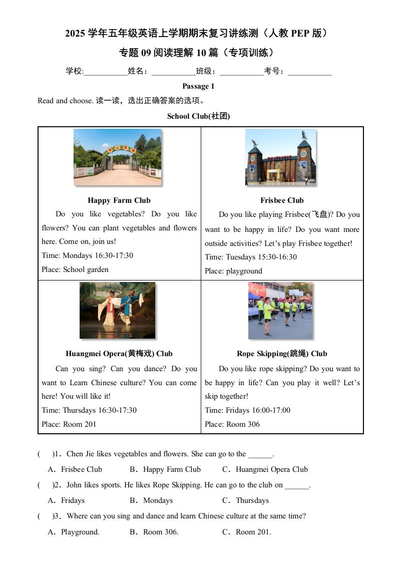 专题09阅读理解10篇(专项训练)五年级英语上学期期末复习讲练测(人教PEP版)
