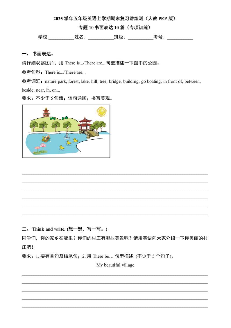 专题10书面表达10篇(专项训练)五年级英语上学期期末复习讲练测(人教PEP版)
