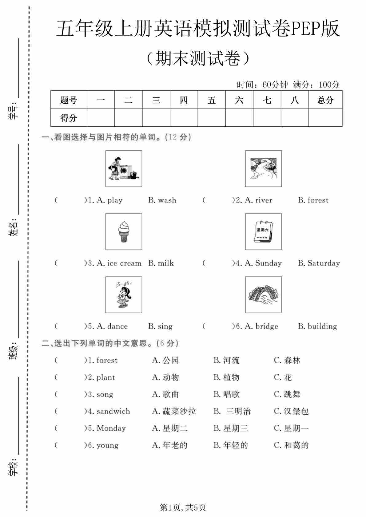 五年级(上)英语 期末模拟测试卷《人教版PEP》