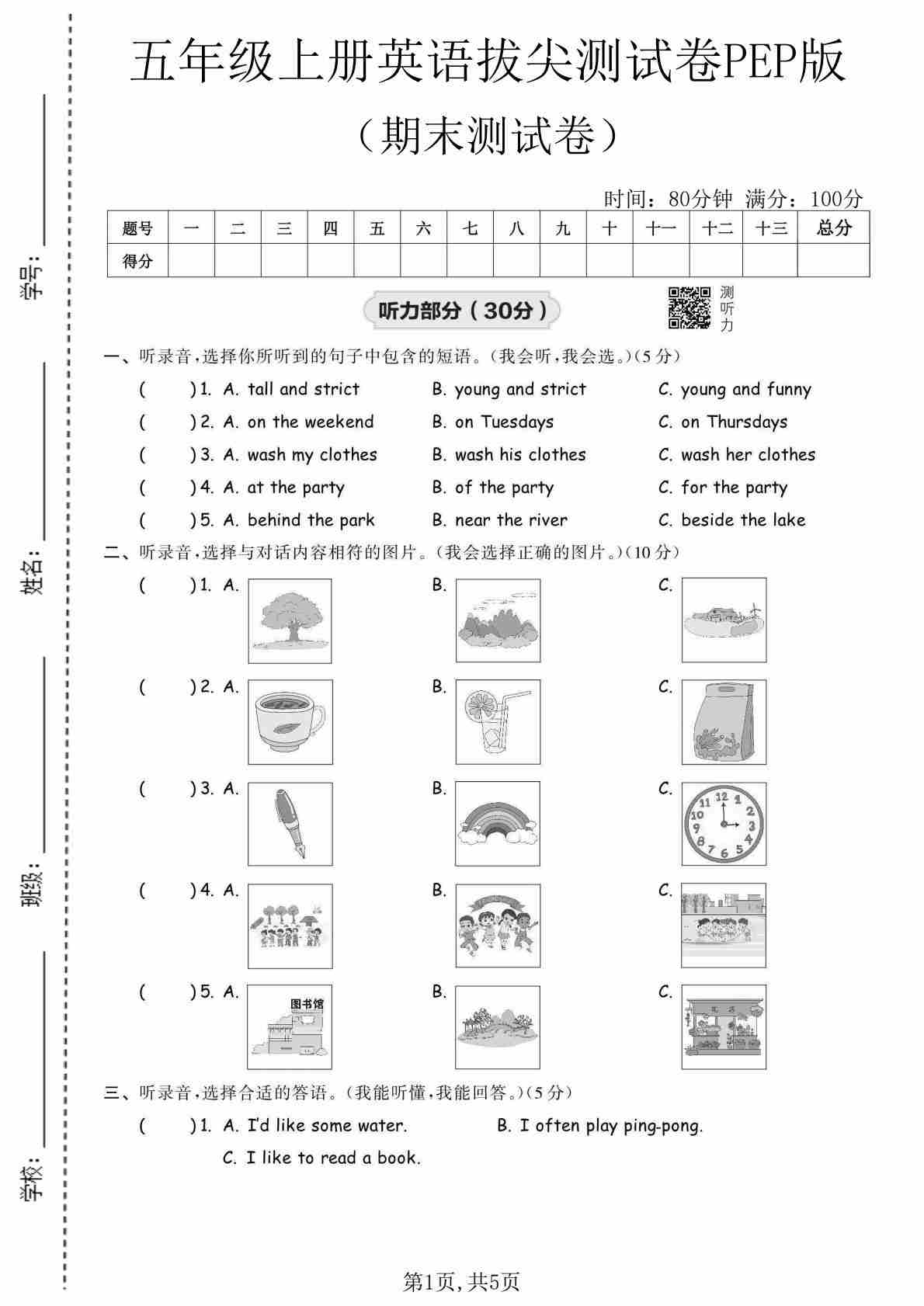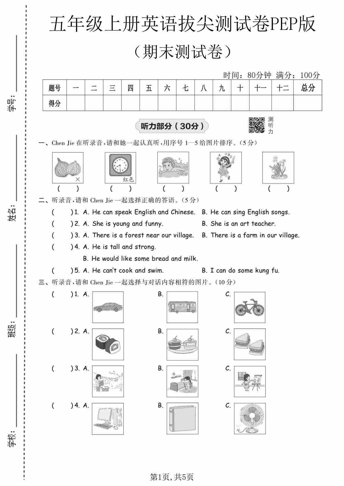 五年级(上)英语 期末拔尖测试卷《人教版PEP》1