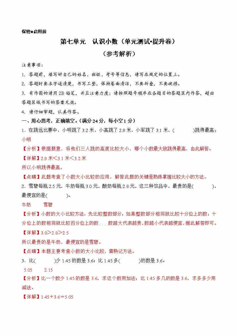 第七单元 认识小数(单元测试 提升卷) (参考解析)
