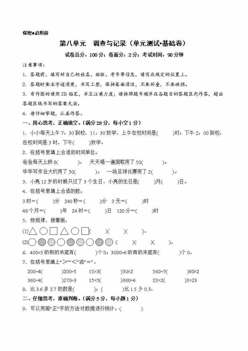 第八单元 调查与记录(单元测试 基础卷) (A4版)