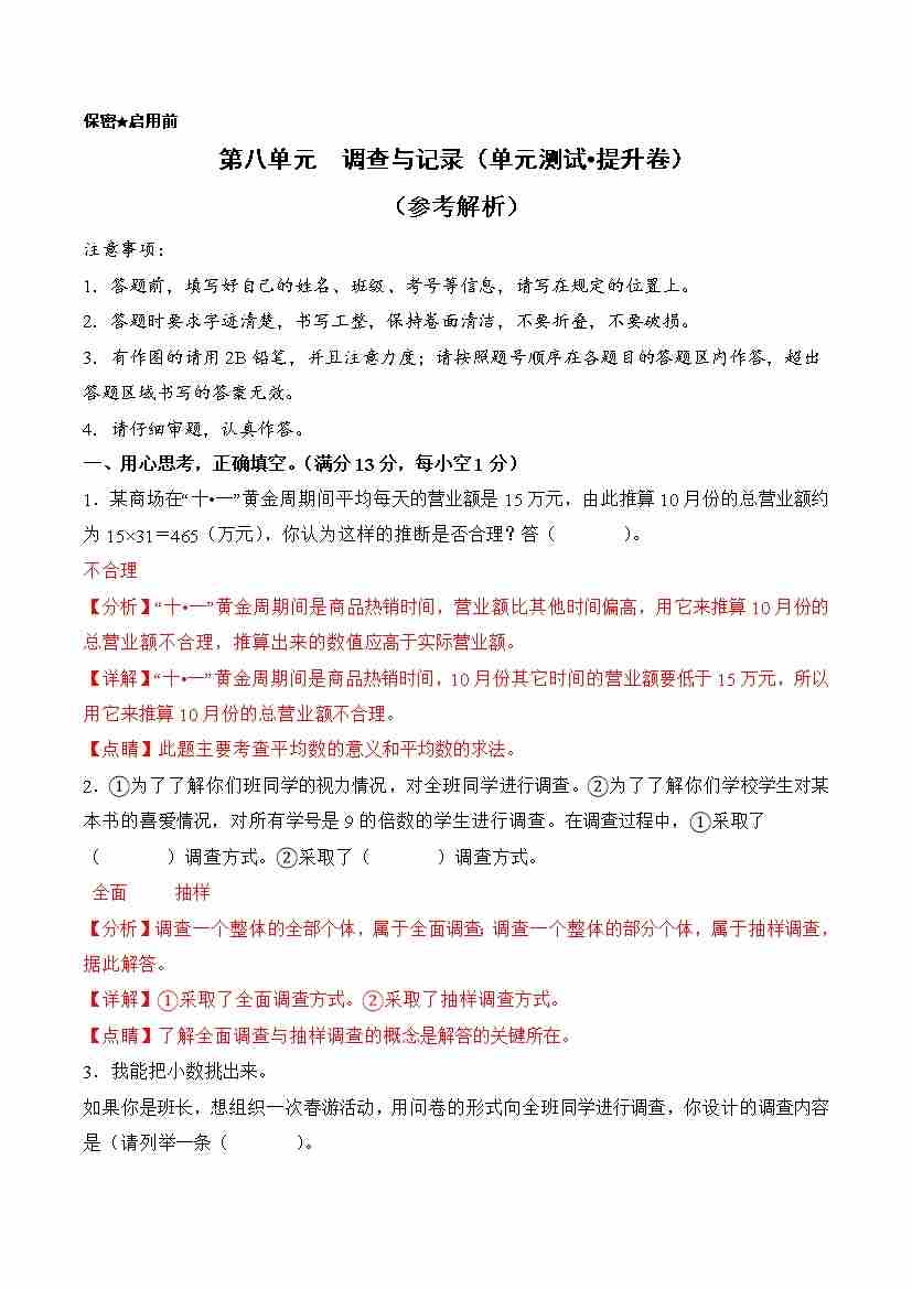 第八单元 调查与记录(单元测试 提升卷) (参考解析)