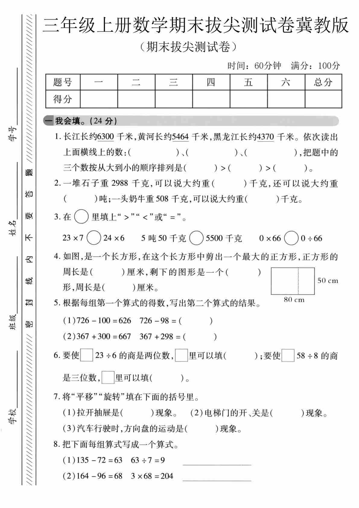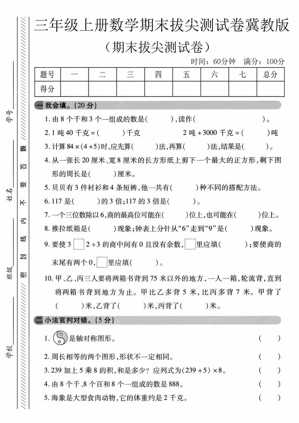 三年级(上)数学 期末拔尖测试卷3《冀教版》
