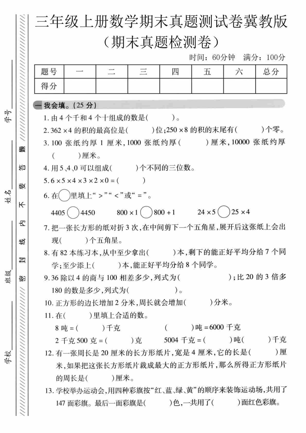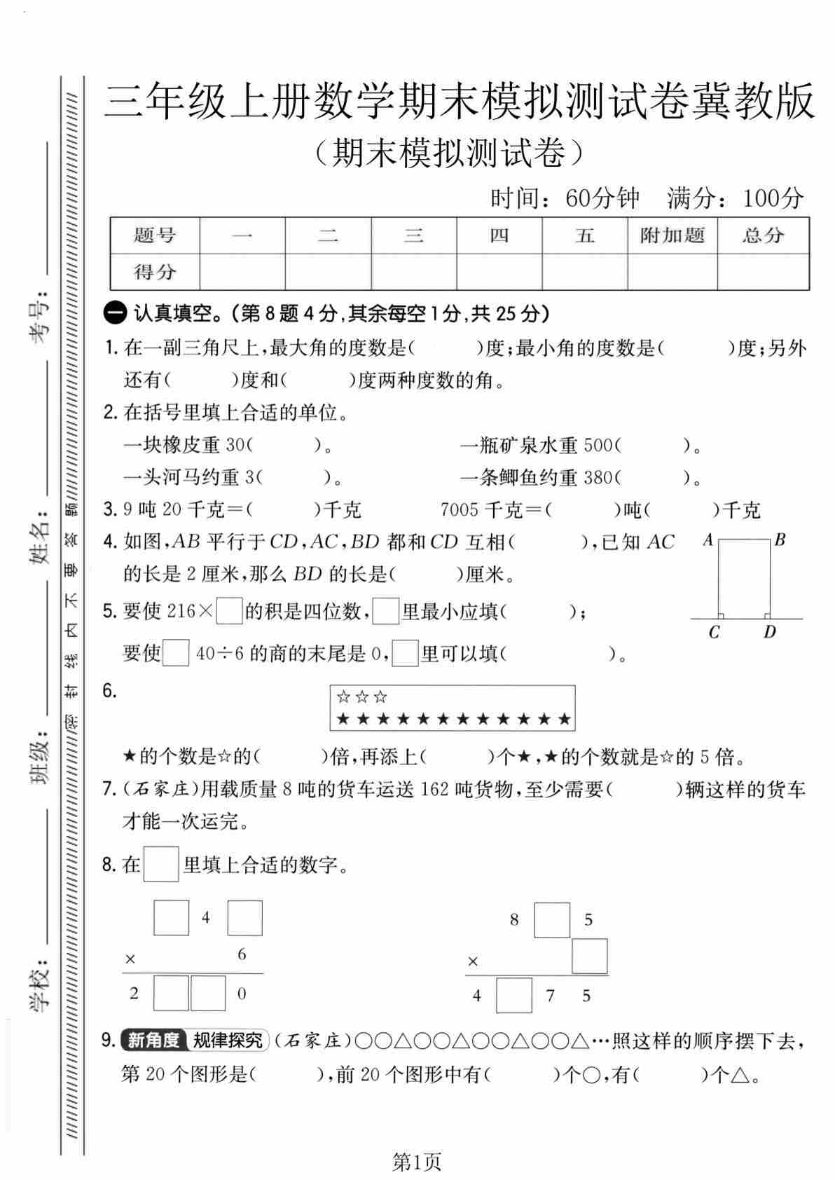 三年级(上)数学 期末模拟测试卷1《冀教版》
