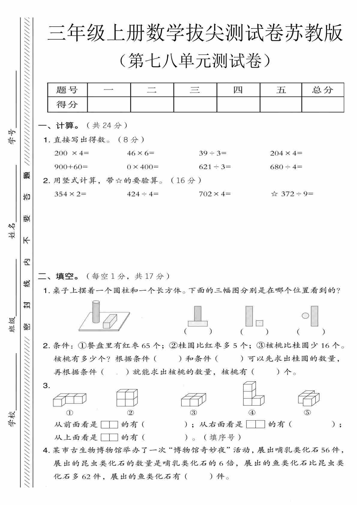 三年级(上)数学 第七八单元拔尖测试卷2《苏教版》
