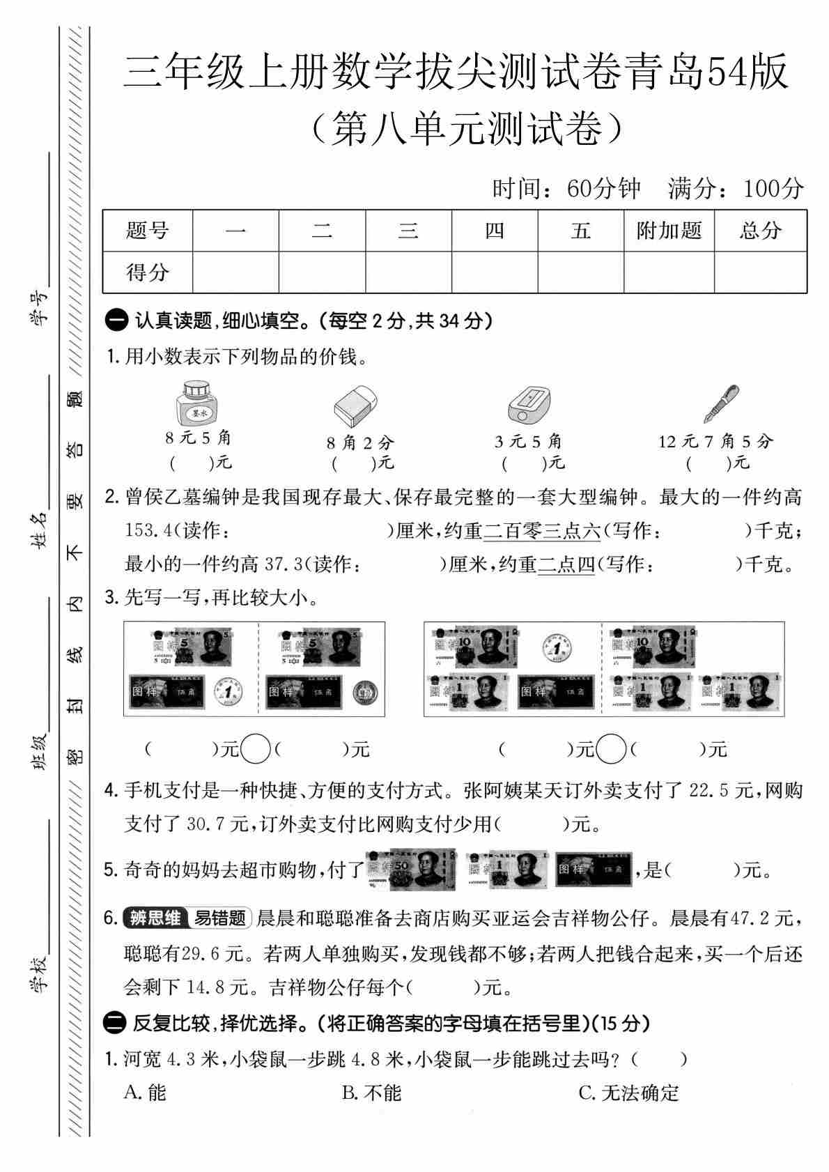 三年级(上)数学 第八单元拔尖测试卷《青岛54版》