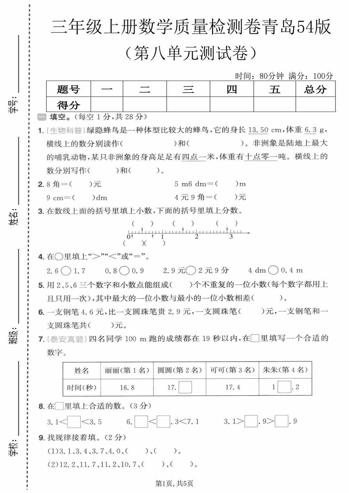 三年级(上)数学 第八单元质量检测卷《青岛54版》