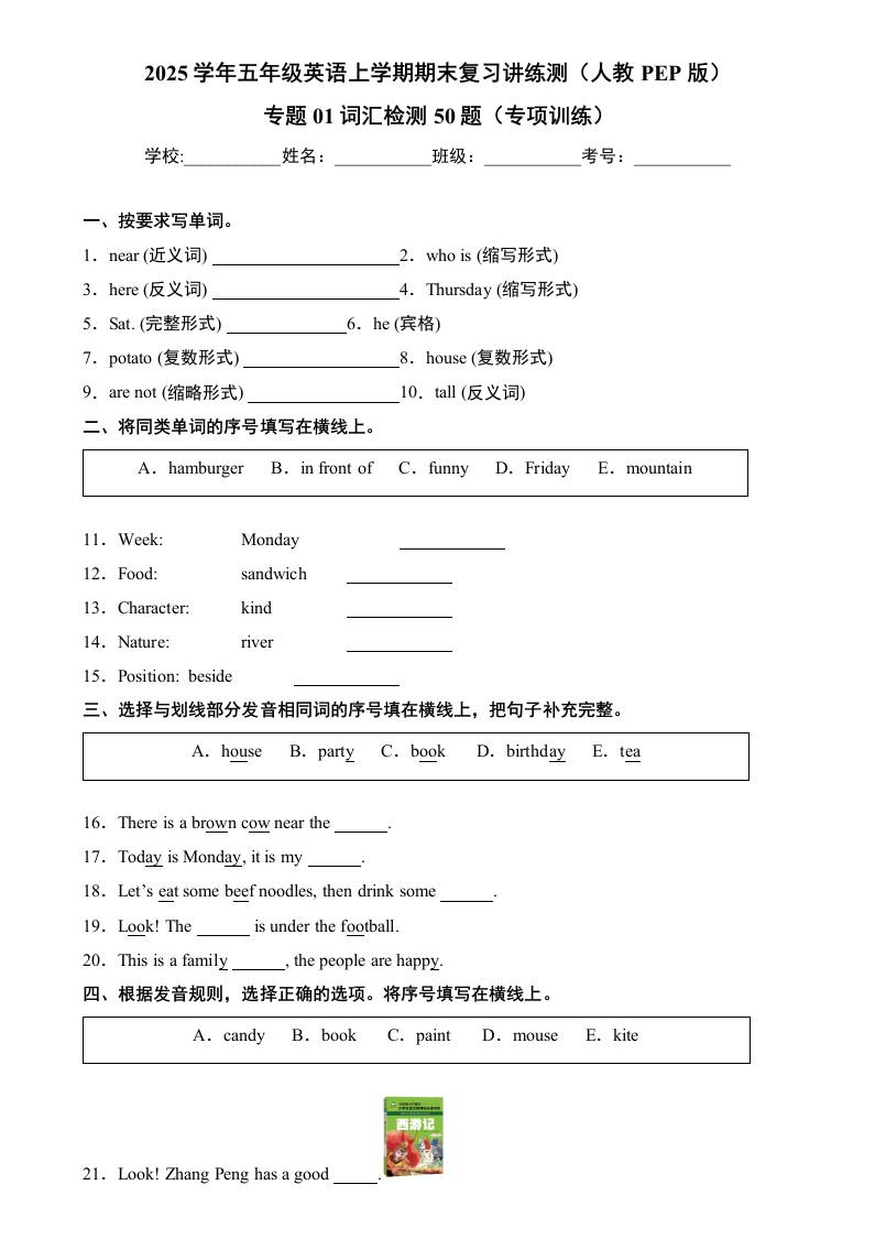 专题01词汇检测50题(专项训练)五年级英语上学期期末复习讲练测(人教PEP版)