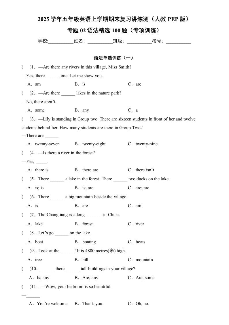 专题02语法精选100题(专项训练)五年级英语上学期期末复习讲练测(人教PEP版)